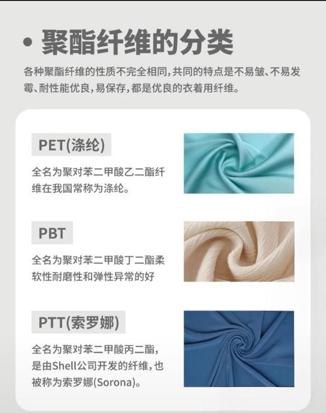 那么,作为合成纤维,聚酯纤维就意味着低廉吗?我们先来看一下聚酯纤维的分类。根据化学结构中二元醇链段的长度差异,聚酯纤维分为PET(聚对苯二甲酸乙二醇酯)、PBT(聚对苯二甲酸丁二醇酯)和PTT(聚对苯二甲酸丙二醇酯)三种,由于这三种性能差异不同,应用的领域和价值也不相同。通过高端的工艺处理,聚酯纤维可以形成极具功能性和质感的面料,生产成本甚至会比传天然面料更高,例如一些防水透气、光滑高级的功能性面料。