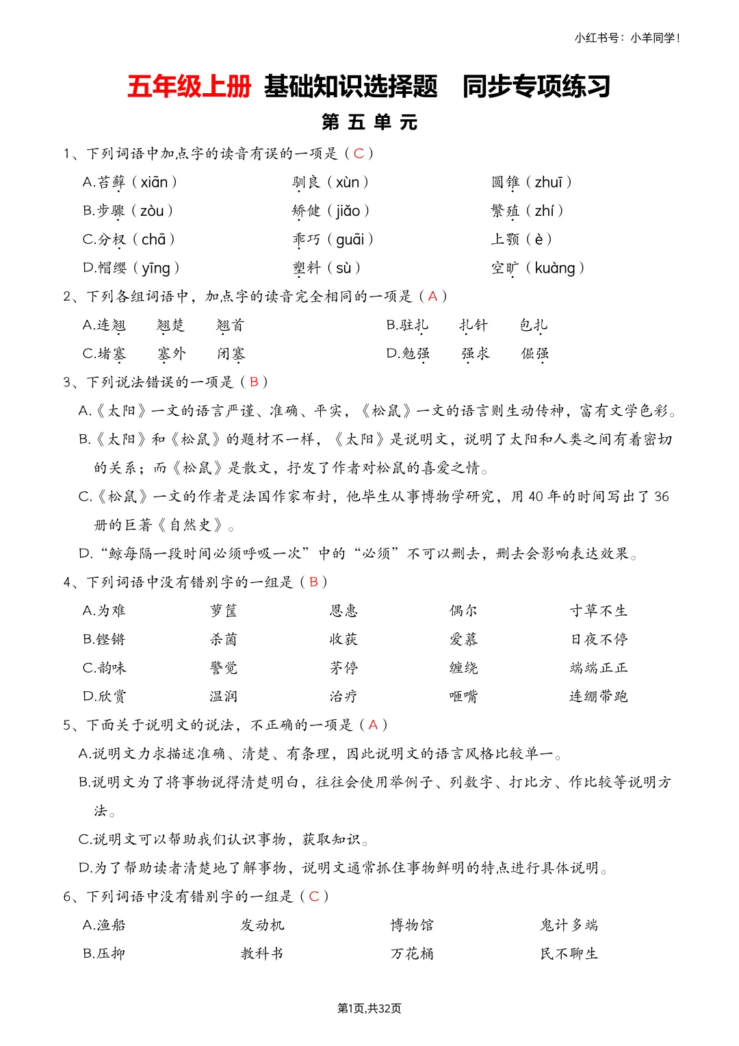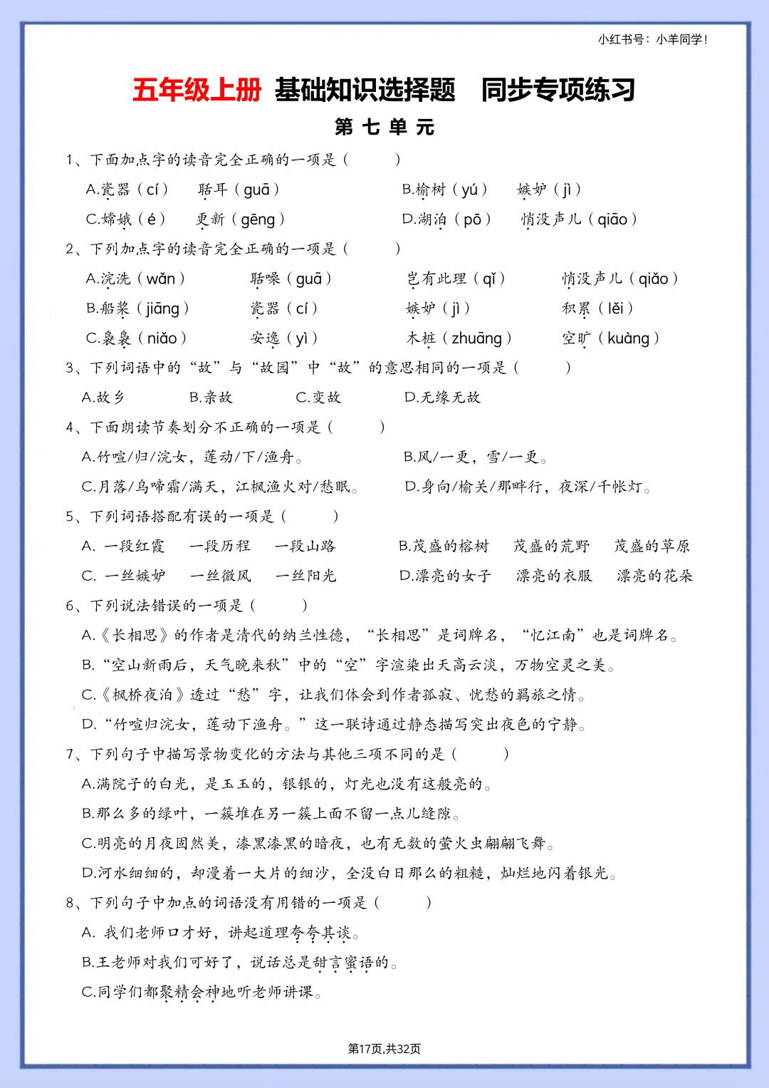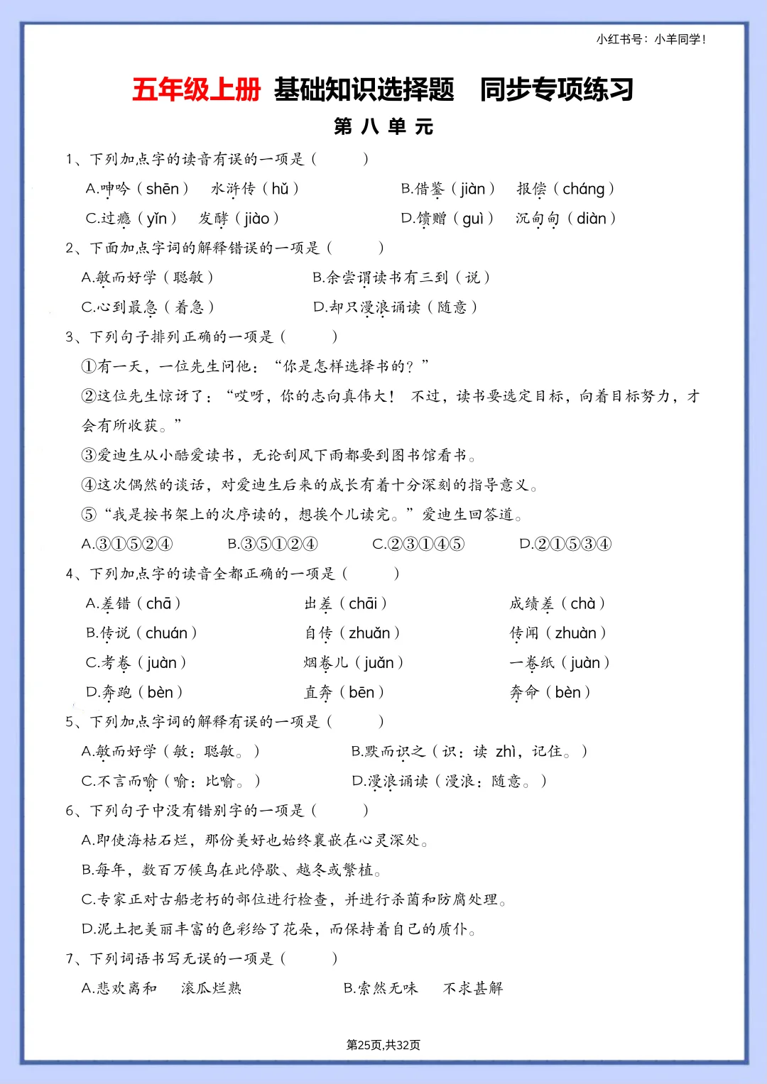 谁懂啊!五年级上册语文基础总丢分?这套选择题专项直接把考点扒得明明白白!