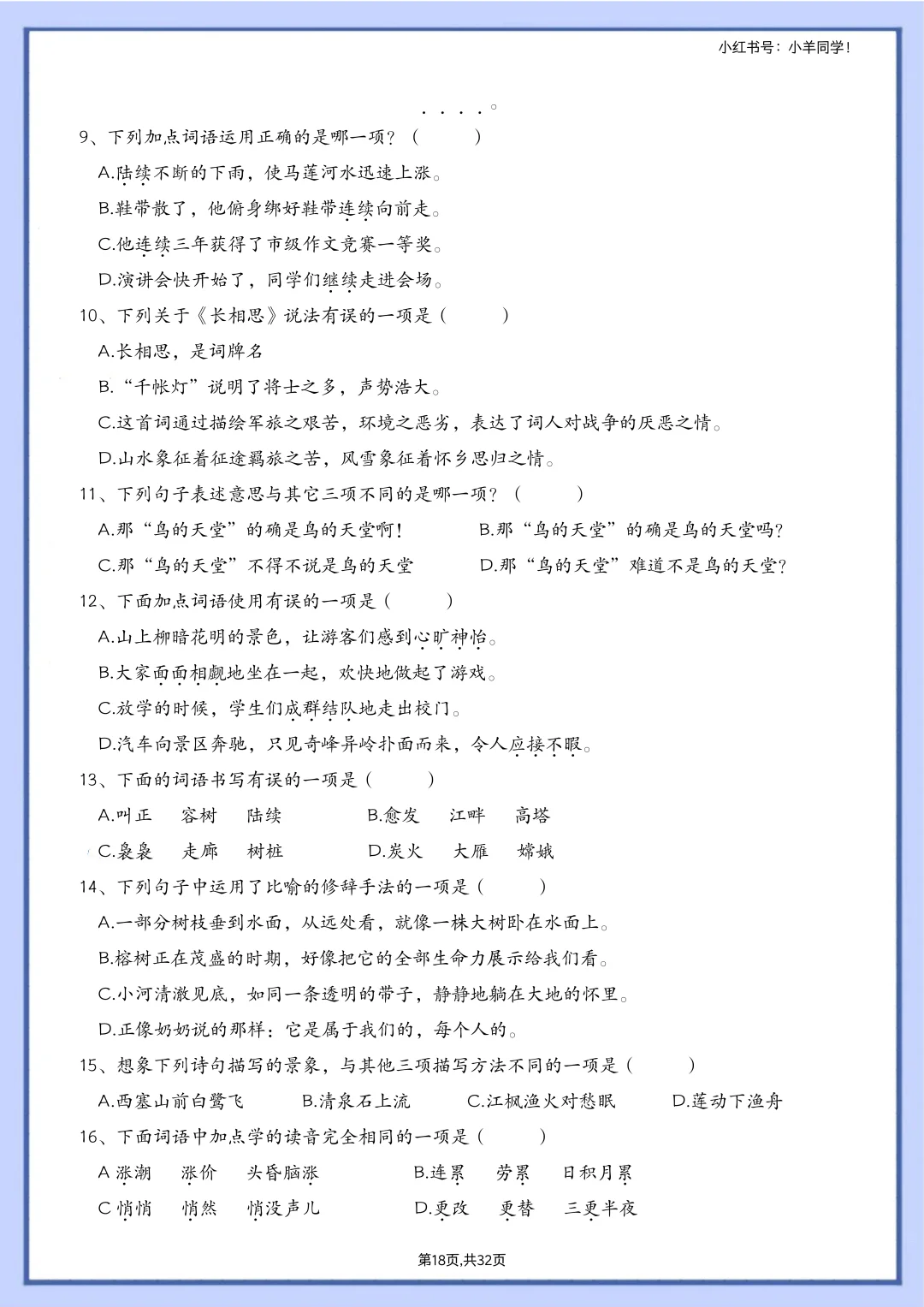 字音字形辨析、标点符号用法、拼音规则练习、诗句深层理解、修辞手法判断、口语交际应对、病句修改技巧、词句段运用、近义词反义词辨析、课文内容吃透、句式转换(陈述句 / 反问句 / 把字句啥都有)、词语搭配逻辑、名句情景运用、关联词衔接……