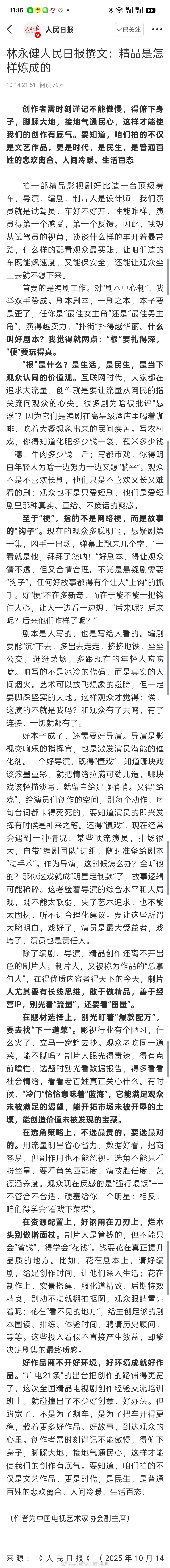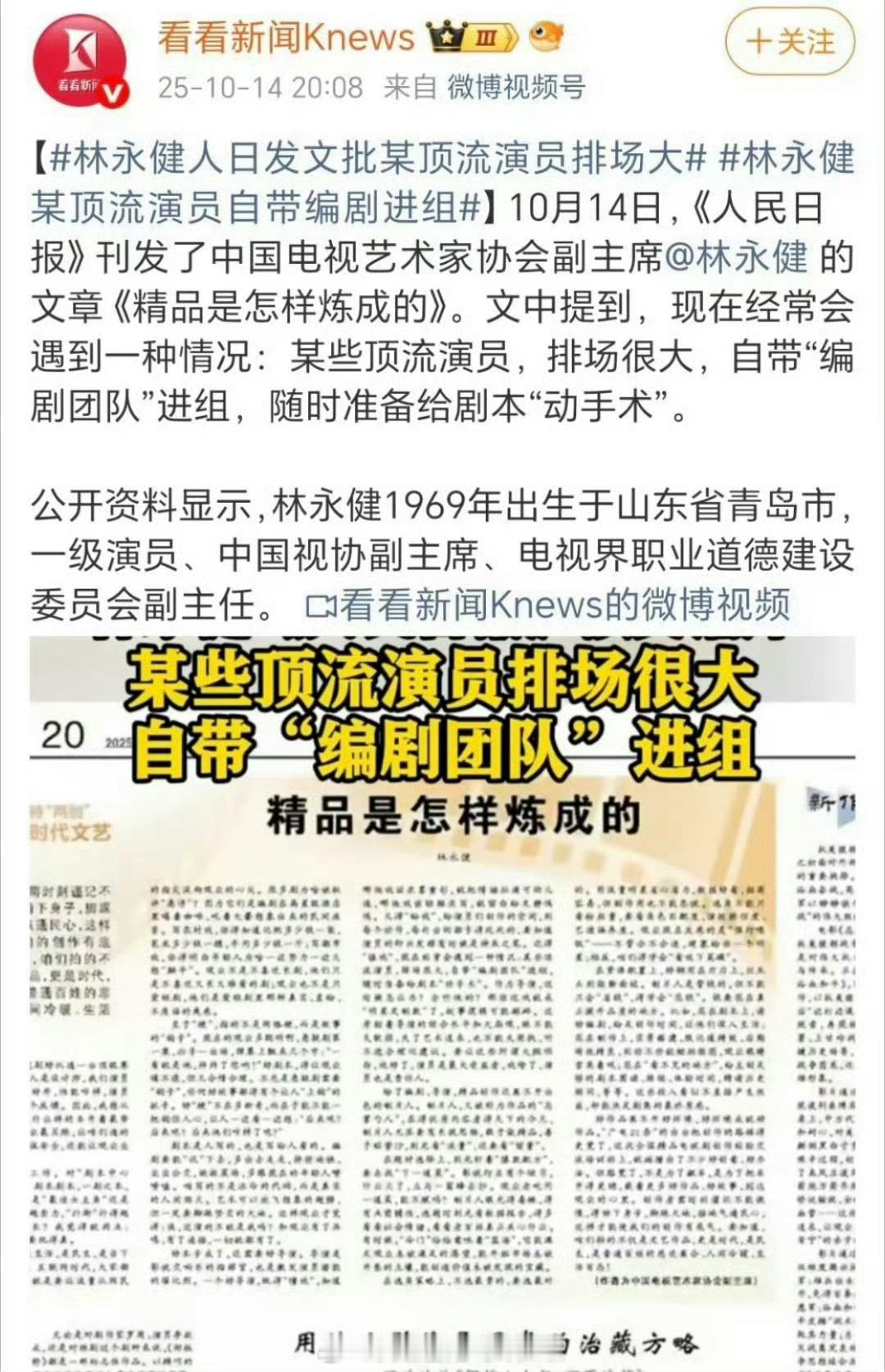 林永健在人民日报发文《精品是怎么练成的》,痛批某些顶流演员带编剧进组,不满意随时改剧本,让剧变成明星定制款