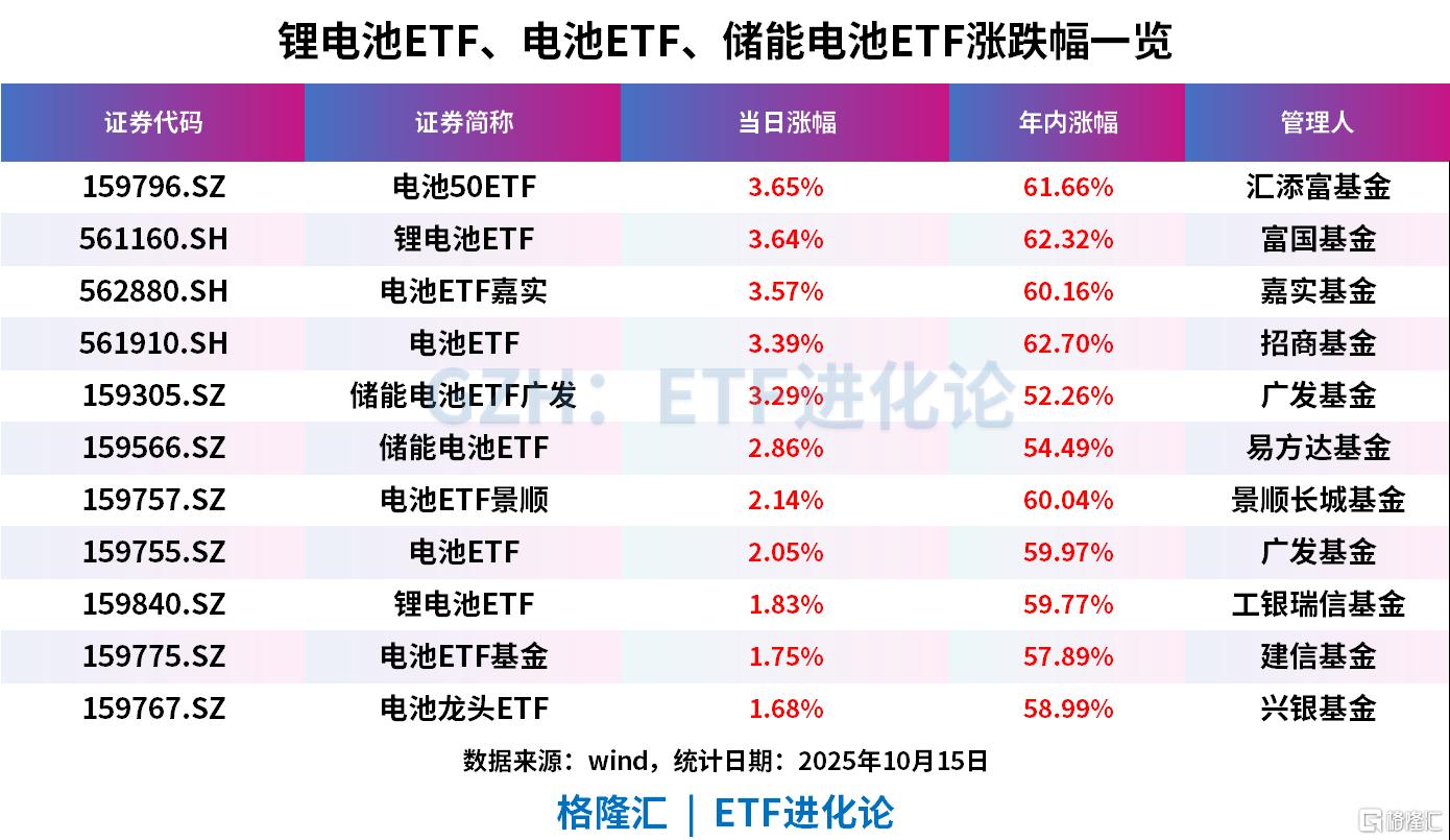 午后三大股指集体反弹,锂电池、汽车整车、汽车零部件等板块涨幅居前,电池50ETF、锂电池ETF、电池ETF嘉实、电池ETF、储能电池ETF广发涨超3%;储能电池ETF、电池ETF景顺、电池ETF、锂电池ETF、电池ETF基金、电池龙头ETF上涨。