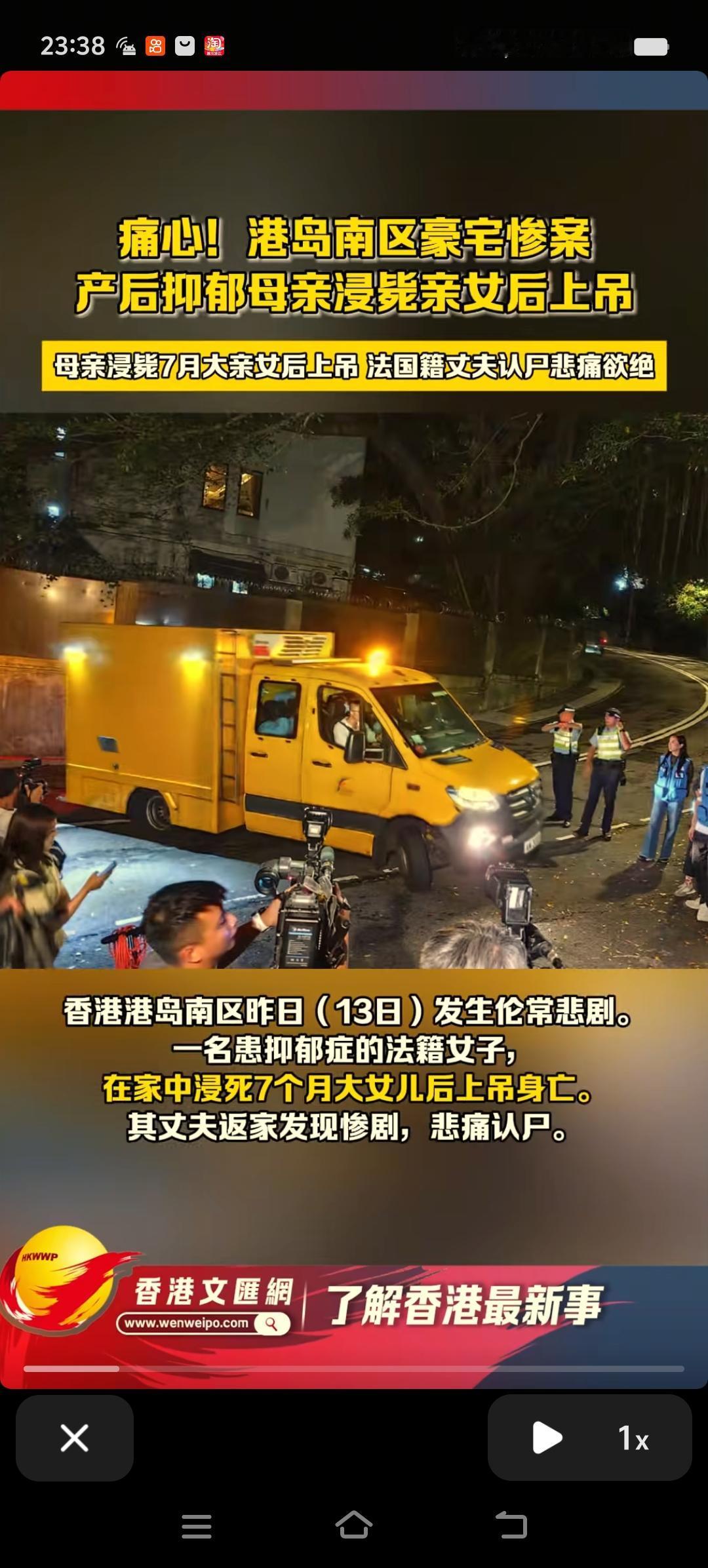 2025年10月13日,星期一,下午4时左右,香港寿山村道6A寿山花园发生一起母女双尸案,据说女子产后抑郁,溺亡了自己几个月大的孩子之后自缢身亡,产后抑郁需要做好心理辅导和干预,别让产后抑郁害了一个家庭,这位法籍妈妈非常痛苦,对不起自己的老公,却也舍不得自己的骨肉与自己分离,于是,她带走了自己的孩子,留下丈夫痛苦的思念。