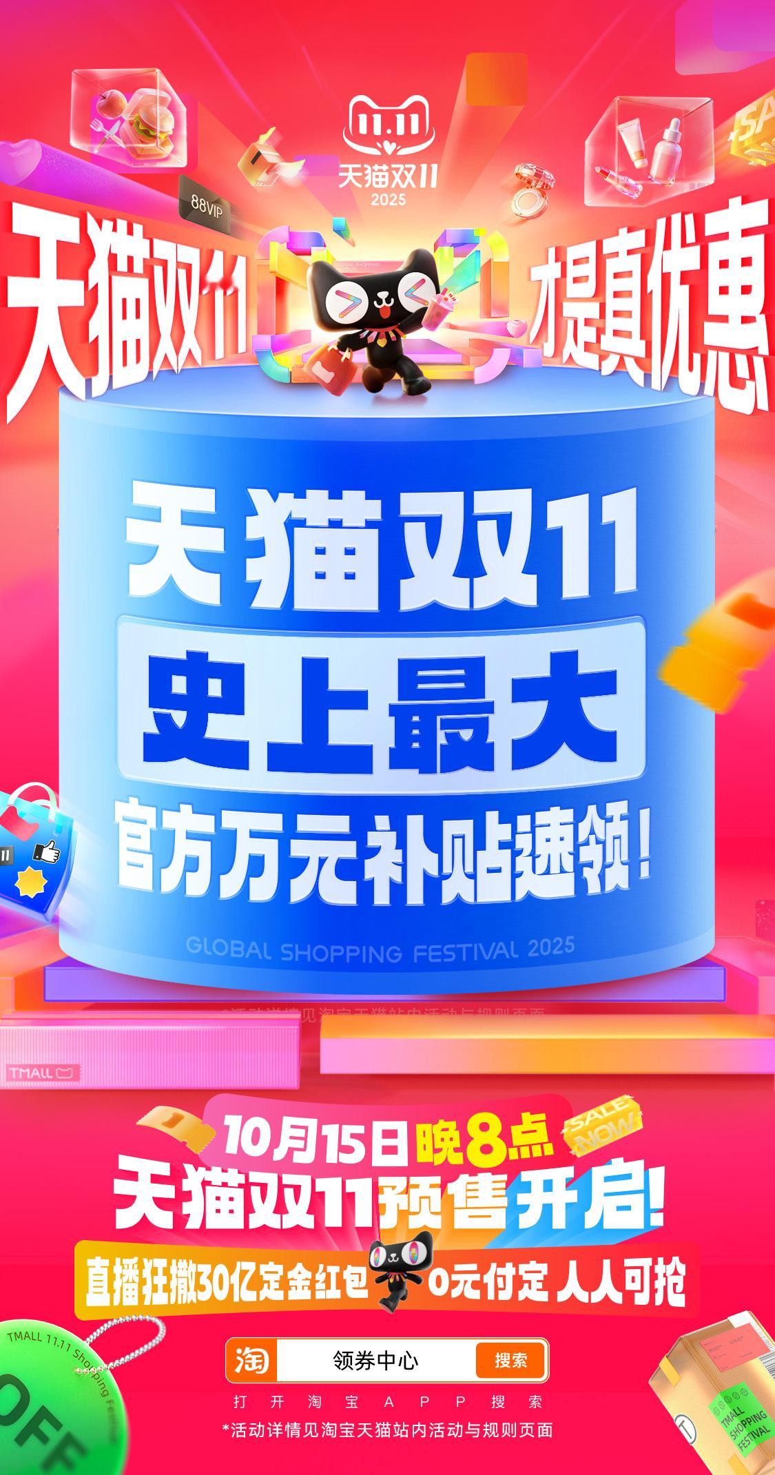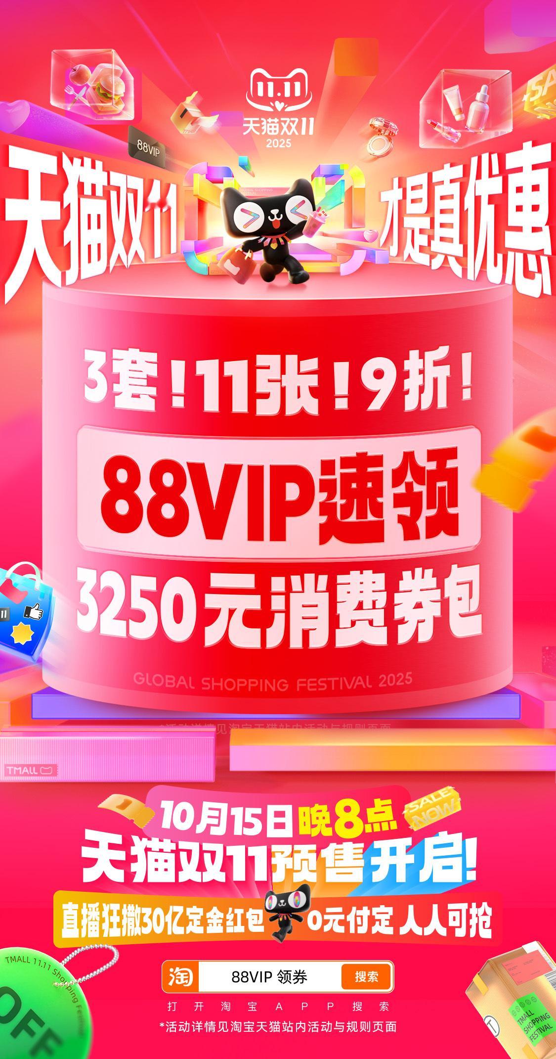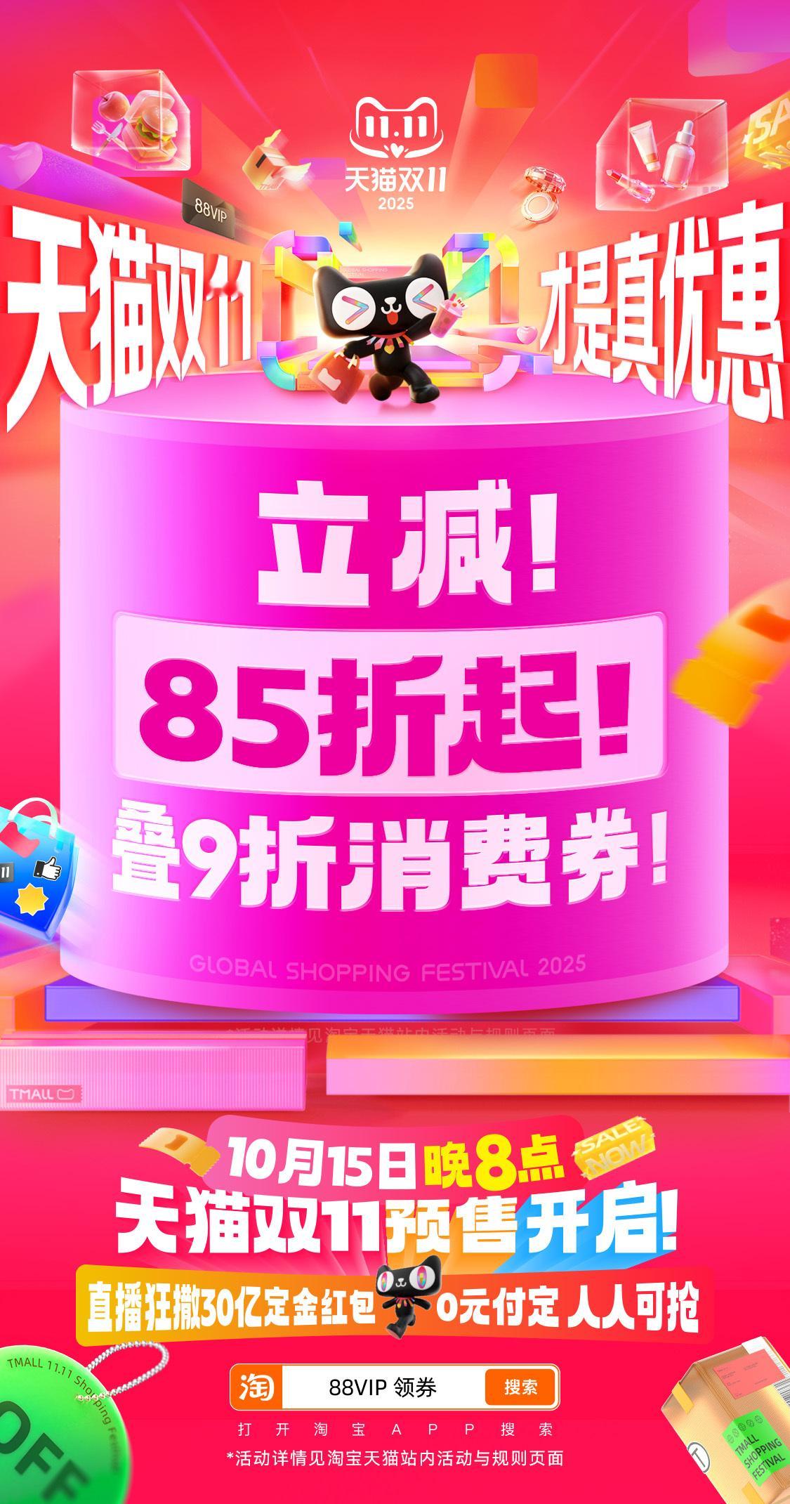 今晚8点天猫双11才是真优惠 敲黑板:天猫双11今晚8点正式开始,大家别错过了!玩法简单直接,立减85折起还可叠史上最大3250元大额消费券包,笔笔都是真优惠!对了,还有国补现货开卖真5折,记得上淘宝搜索【天猫双11预售】提前加购!省心省力又省钱,今晚8点天猫双11预售付定爆款预售今晚都能0元付定啦,家人们速冲!天猫双11才是真优惠
