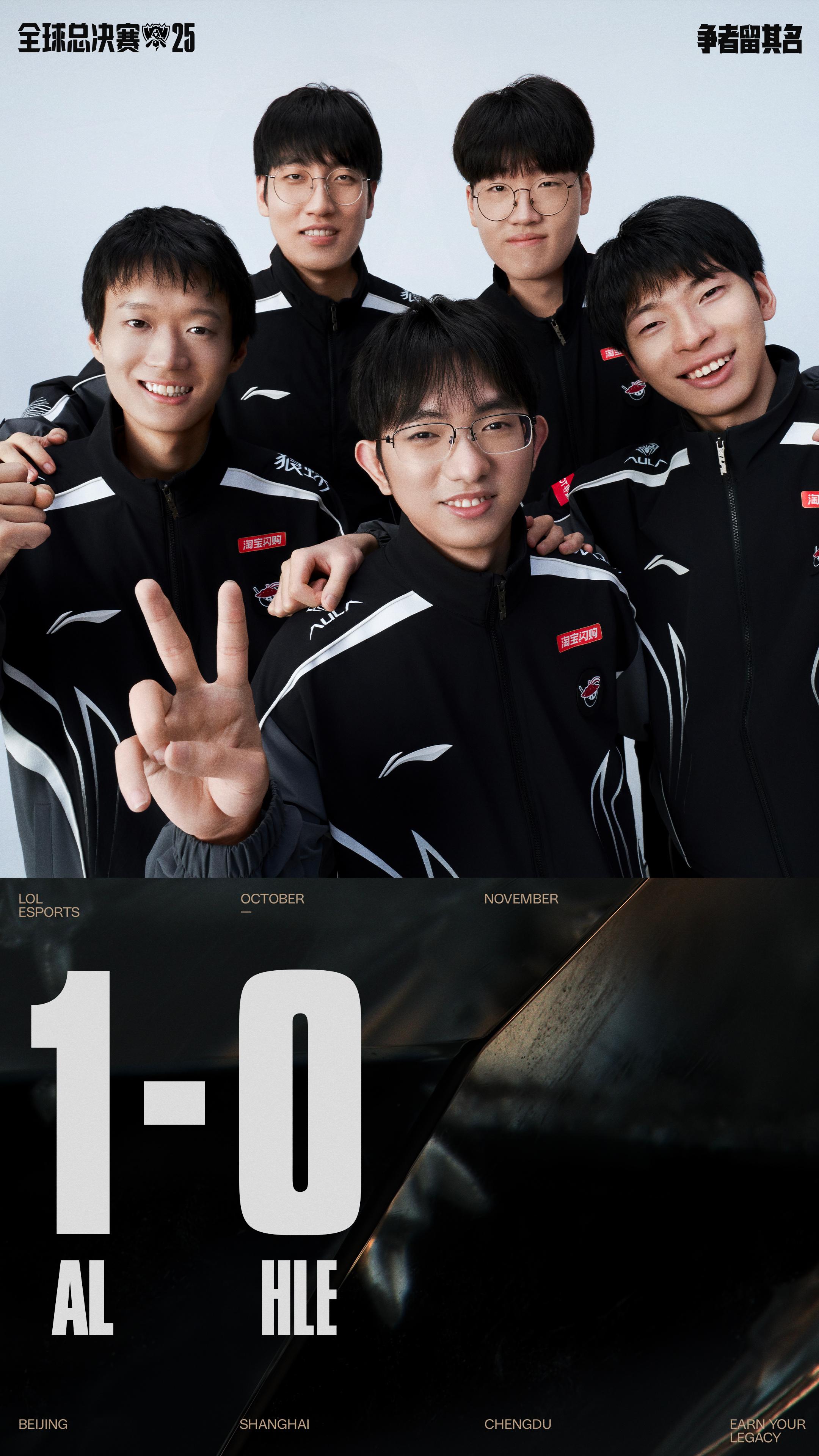 虎扑10月15日讯S15瑞士路首日,AL1-0HLE。LPL官方发文:众志同行,锐意进发。恭喜AL赢下瑞士轮第一轮比赛!