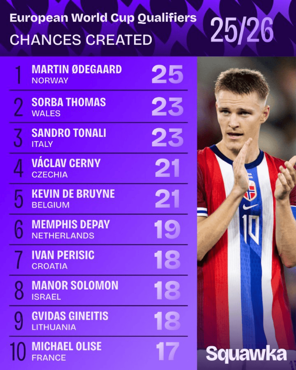 虎扑10月15日讯Squawka统计了本届世界杯欧洲区预选赛创造机会最多的球员,详情如下: