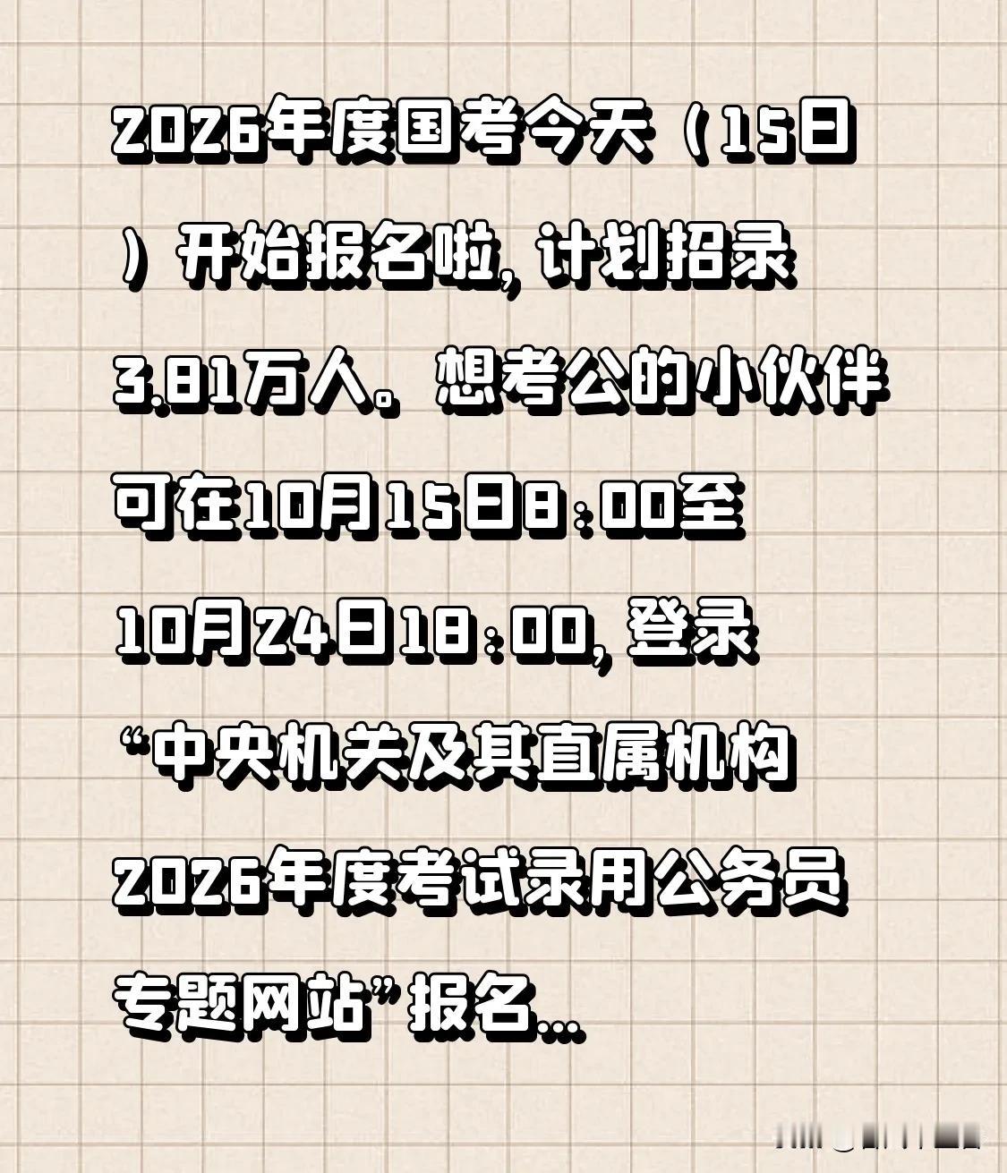 2026年度国考今天(15日)开始报名啦,计划招录3.81万人。想考公的小伙伴可在10月15日8:00至10月24日18:00,登录“中央机关及其直属机构2026年度考试录用公务员专题网站”报名。公共科目笔试11月30日在多地同时举行。 这次报考年龄条件放宽了,一般是18到38周岁,2026年应届硕士、博士研究生放宽到43周岁。机会难得,符合条件的都可以试试,说不定能成功上岸,开启不一样的职业人生!
