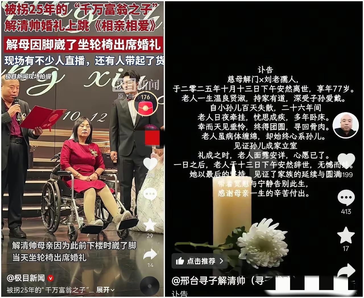 找到亲生父母后的解清帅本来是要高高兴兴结婚的,结果父亲解克锋在婚礼上嚎啕大哭,母亲还坐上了轮椅,全家人哭哭啼啼没有一个高兴的,原因是解清帅的奶奶在这个大喜的日子阖然长逝了,所以一家人正经历丧亲之痛,偏偏又赶上了解清帅结婚,这又是喜事。真是悲喜交加,让人揪心。 我觉得老人去世赶上儿孙婚礼,秘不发丧是对的。因为婚礼日期都是提前定好的,而且是孩子一辈子的人生大事。 其实在古代这叫冲喜,老人都是最朴实的,最大的心愿就是看到儿孙成家立业,现在解清帅结婚,老人也看到了,也算是完成了心愿。
