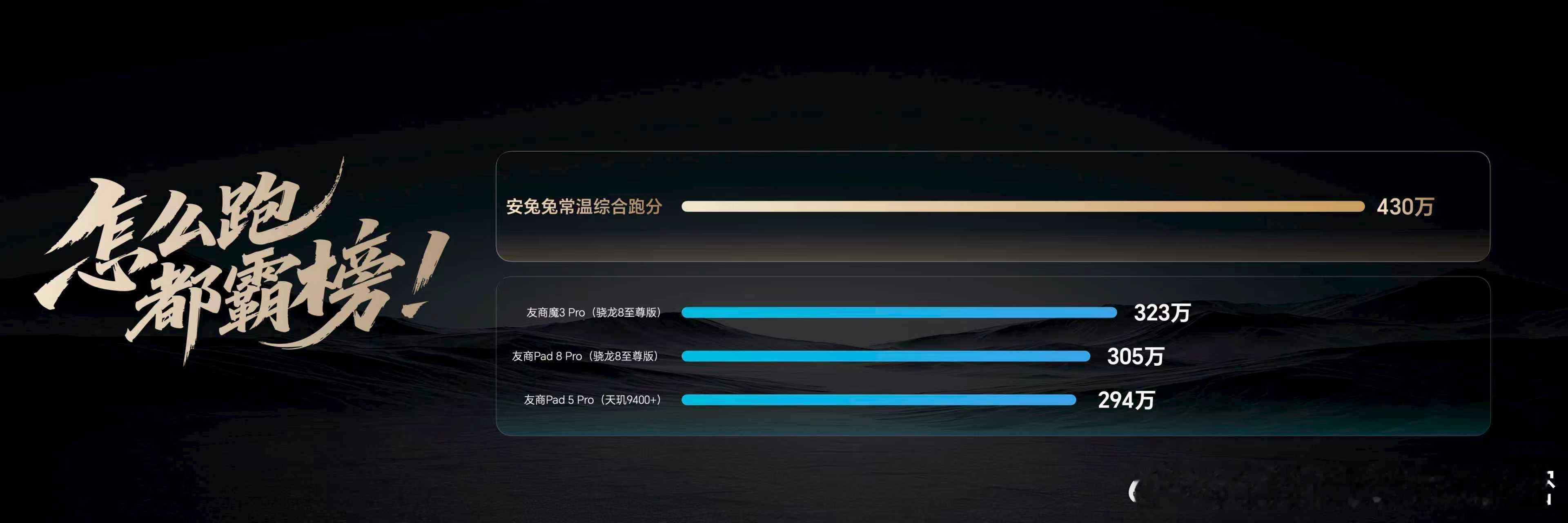 怎么跑,都霸榜!荣耀MagicPad3Pro是全球首款搭载第五代骁龙8至尊版的平板,常温版环境下安兔兔跑分突破430万称霸榜单,支持至多20个窗口同时运行,Pro级性能表现领先行业。《鸣潮》帧率与控温领先同级,《原神》可稳定运行120帧+2.6K高画质,超分超帧表现业界超强。 ​​​