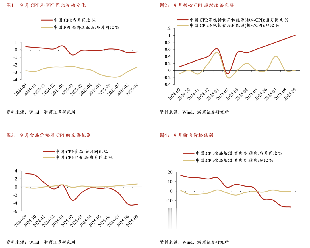 9月CPI同比下降0.3%(前值-0.4%),低于市场预期(Wind一致预期为-0.1%)和我们预测,9月环比增速录得0.1%(前值0%),主要受食品价格回升影响。具体来看,9月CPI同比受上年价格变动的翘尾影响约为-0.8个百分点,较8月收窄0.1个百分点;从新涨价看,9月CPI受今年以来价格变动的影响约为0.5个百分点,较8月持平。从结构上看,CPI八大类价格同比增速呈现六涨两降。9月其他用品及服务、生活用品及服务、衣着价格同比上涨较多,同比分别上涨9.9%、2.2%和1.7%;医疗保健、教育文化娱乐、居住价格同比涨幅相对稳定,同比维度分别上涨1.1%、0.8%和0.1%;食品烟酒、交通通信价格则同比分别下降2.6%和2.0%。在其他用品及服务中,金银饰品涨价因素较大,受国际金价上涨影响,国内金饰品价格上涨6.5%。