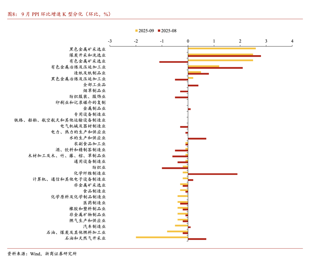 9月PPI同比增速录得-2.3%(前值-2.9%),高于市场预期(Wind一致预期为-2.4%),PPI环比继续持平(前值0%)。
