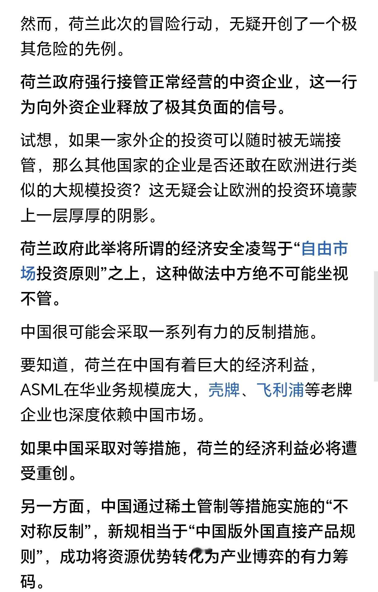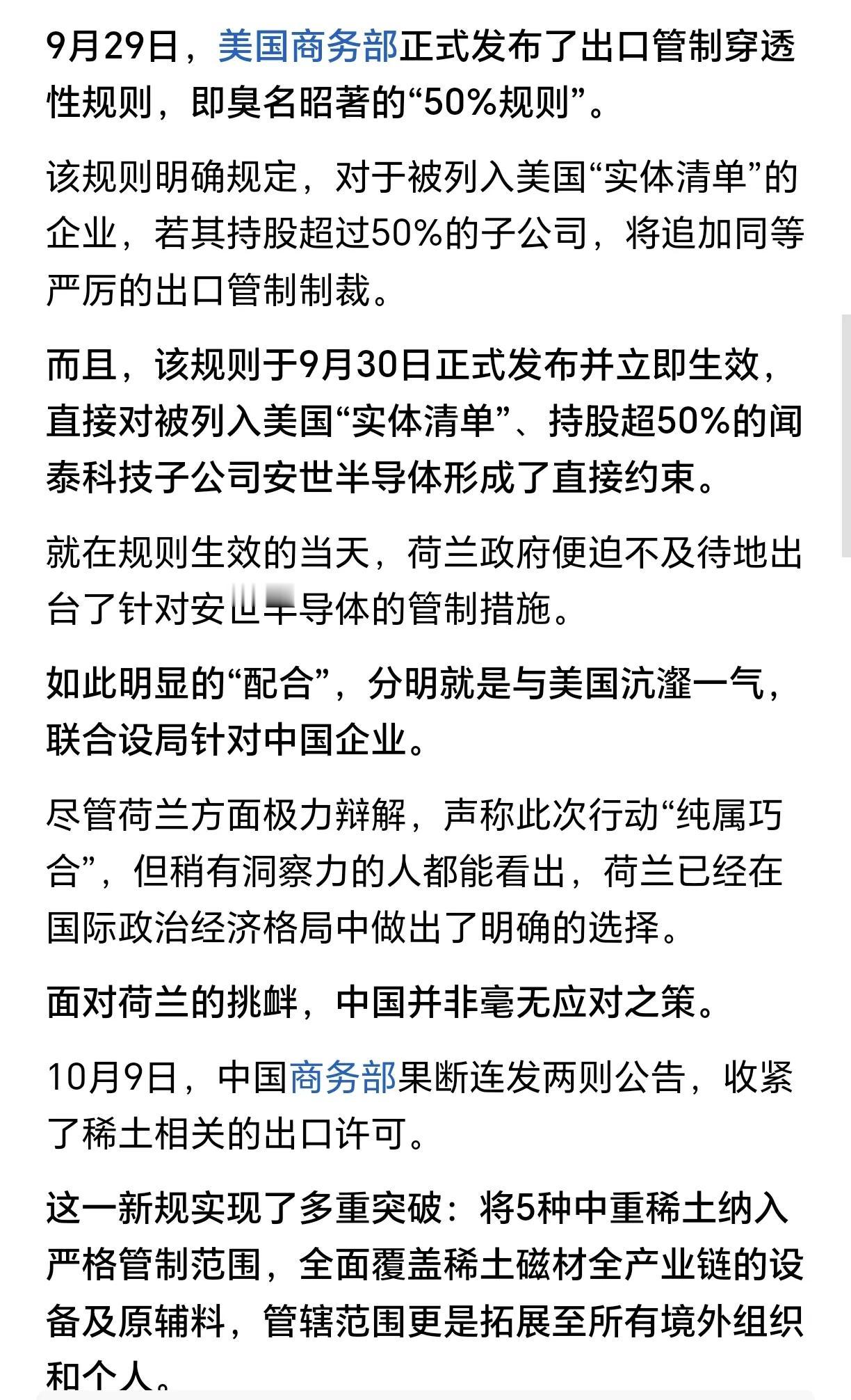 稀土管制升级,对许多敌视我国、小动作不断的国家影响是最大的。 美国可以发布出口管制穿透性规则,对于被列入美国“实体清单”的企业,若其持股超过50%的子公司,将追加同等严厉的出口管制制裁。 这直接对被列入美国“实体清单”、持股超50%的闻泰科技子公司安世半导体形成了威胁。 这也是荷兰政府敢于跟着美国脚步,直接下场“抢劫”安世半导体公司的原因。它背后有美国撑腰背书,就狐假虎威想趁机吃块肥肉。 但我国也可以收紧稀土管制,直接发公告明确:凡是用于研发或生产14纳米及以下逻辑芯片、256层及以上存储芯片,以及相关制造设备、测试设备和材料的最终用途,都将受到严格审批。 对美国、荷兰等欧美国家的高科技产品生产线从原料上进行限制。 荷兰这次充当马前卒,或许觉得能趁机捞好处。但它在我国内的企业利益更大,如果我国政府也采取对等措施,强制接管荷兰在华企业,足够让荷兰得不偿失。 所以荷兰又当又立,一边公开抢劫,一边说什么没有当美国的狗、不针对中国、这只是巧合,就是怕彻底得罪我国,想糊弄过去。