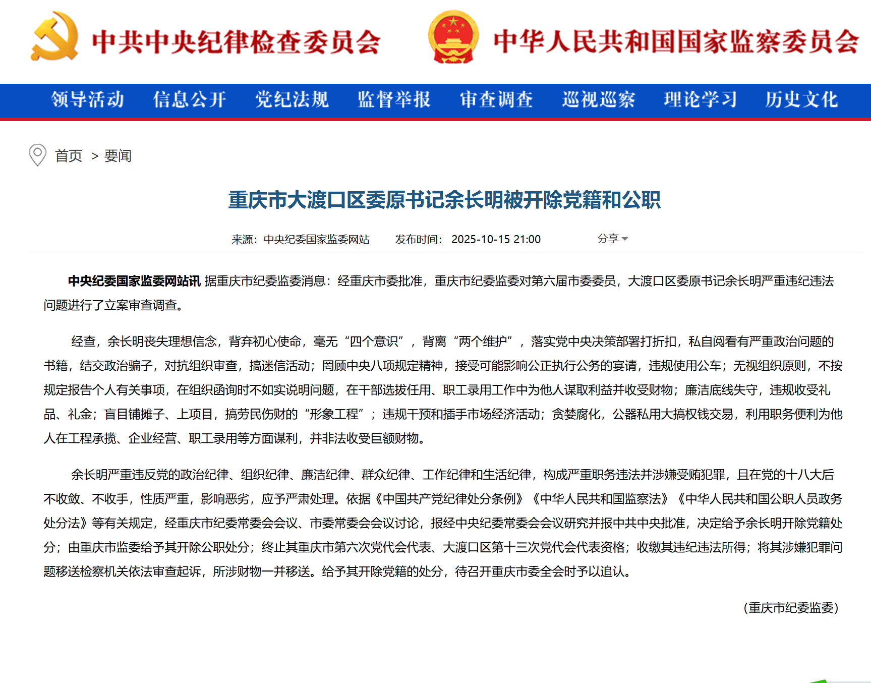 中央纪委国家监委网站10月15日晚通报,经重庆市委批准,重庆市纪委监委对第六届市委委员,大渡口区委原书记余长明严重违纪违法问题进行了立案审查调查。