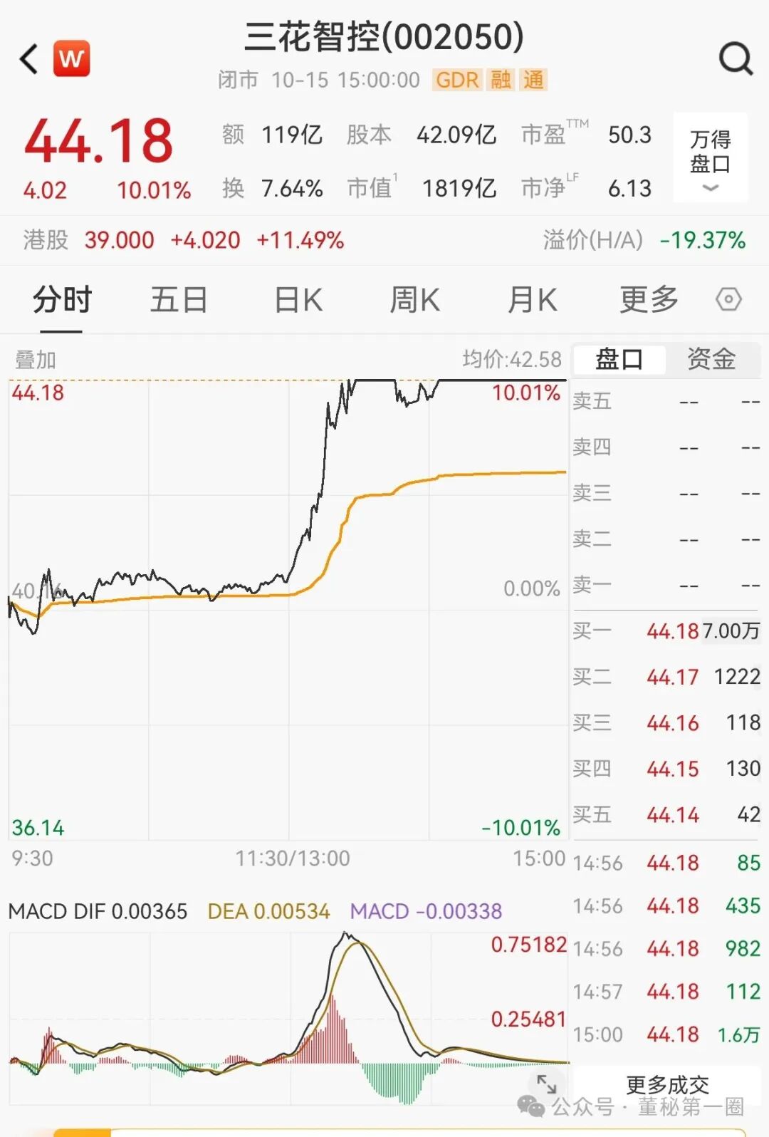 截至A股收盘,三花智控涨停,报44.18元/股,港股报39.5港元/股。
