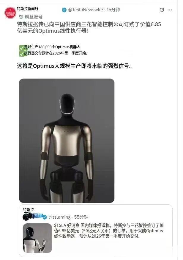 今日市场有传闻称,特斯拉已向中国供应商三花智控下达了价值6.85亿美元的Optimus线性执行器订单。