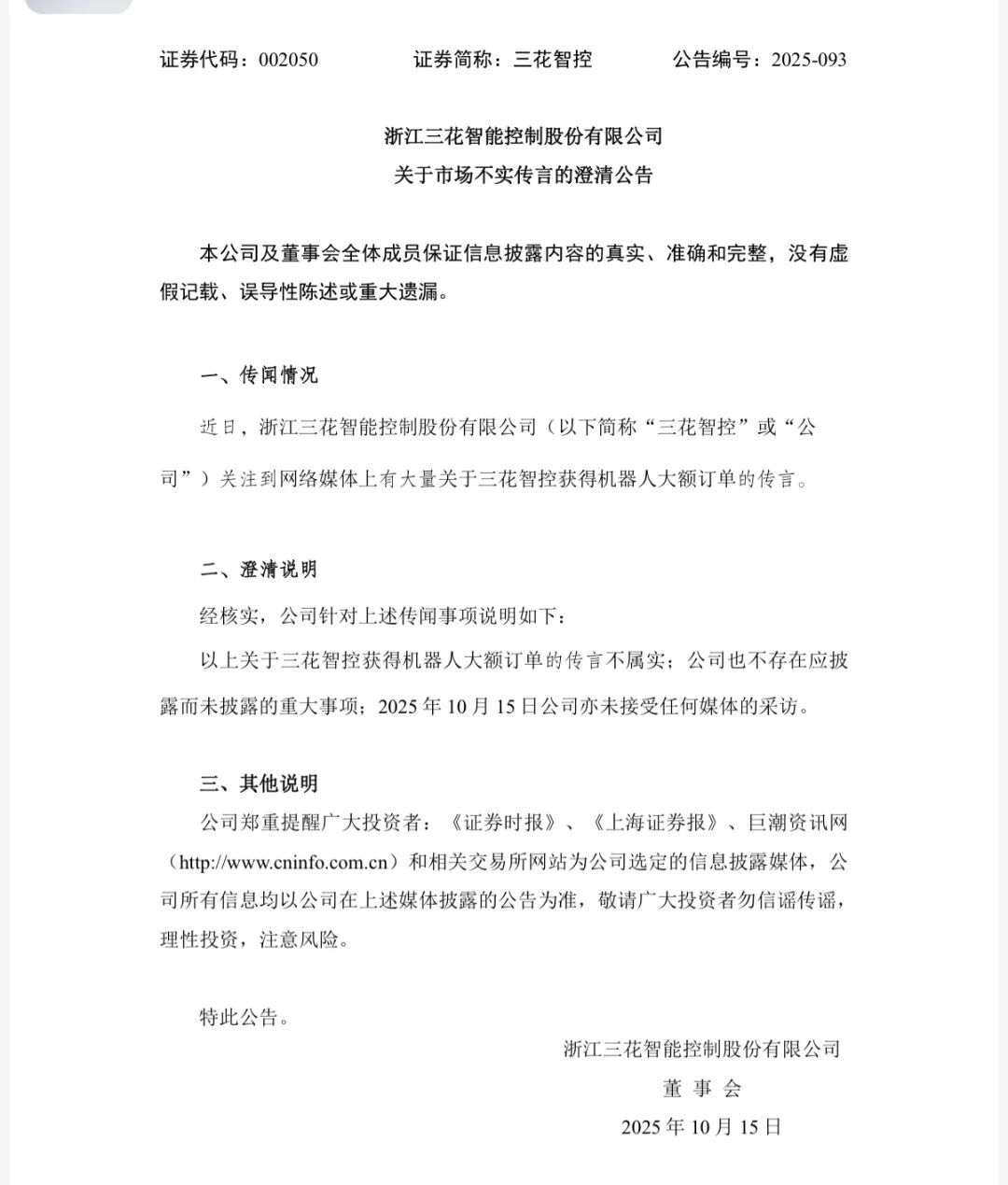 10月15日晚间,三花智控(002050.SZ)公告称,近日关注到网络媒体上有大量关于公司获得机器人大额订单的传言,经核实,该传言不属实。公司也不存在应披露而未披露的重大事项。