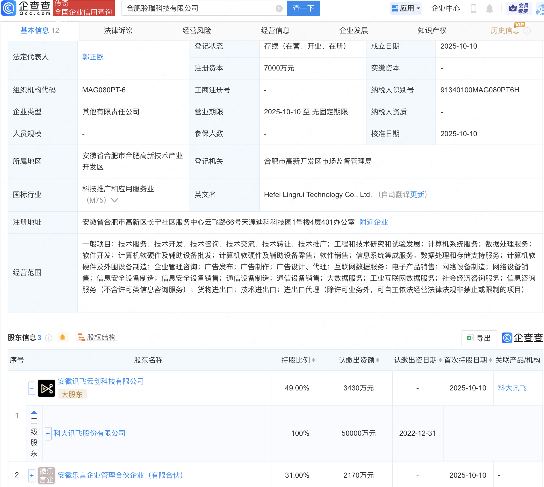 企查查APP显示,近日,合肥聆瑞科技有限公司成立,注册资本7000万元,经营范围包含:信息安全设备制造;信息安全设备销售;通信设备制造;通信设备销售等。企查查股权穿透显示,该公司由科大讯飞(002230)全资子公司安徽讯飞云创科技有限公司等共同持股。