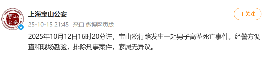2025年10月12日16时20分许,宝山淞行路发生一起男子高坠死亡事件。经警方调查和现场勘验,排除刑事案件,家属无异议。