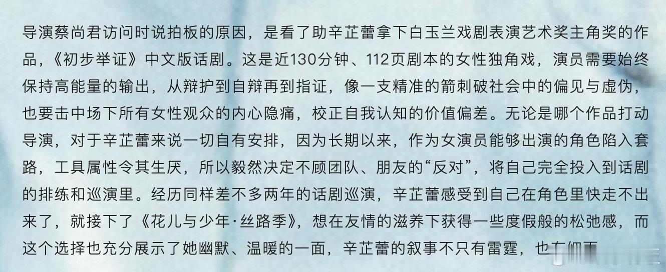 辛芷蕾妈妈让她谨言慎行辛芷蕾曾因厌恶女演员角色套路去尝试话剧 近日,接受采访,分享了自己的演艺经历与内心想法,透露长期以来,作为女演员能出演的角色陷入套路,工具属性令她生厌,于是她不顾团队、朋友 “反对”,毅然将自己完全投入到话剧《初步举证》中文版的排练和巡演中。