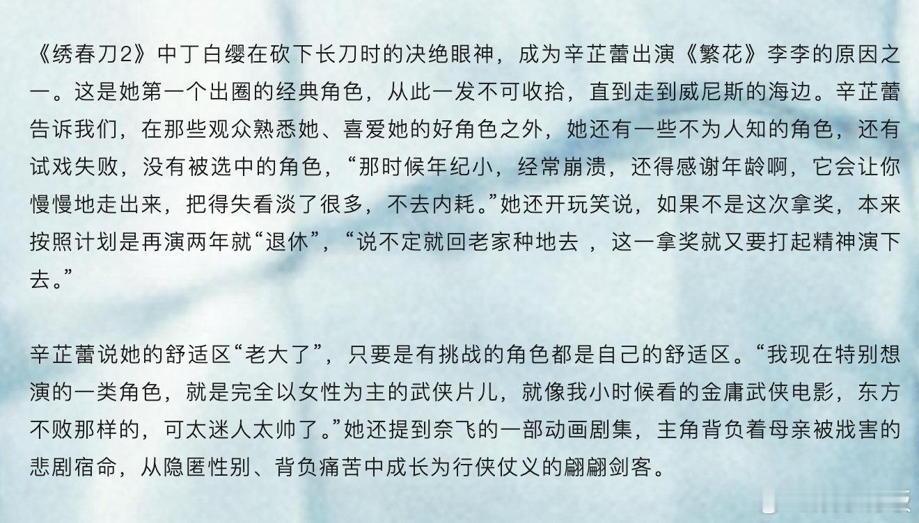 同时,辛芷蕾还分享了与母亲的互动,她提到妈妈听到自己拿奖消息时很激动,哭着感慨不易,但之后也冷静下来,更多提醒她要谨言慎行。辛芷蕾还笑称若不是此次获奖,本打算再演两年就 “退休”,回老家种地,而现在拿奖后又要打起精神继续演下去。