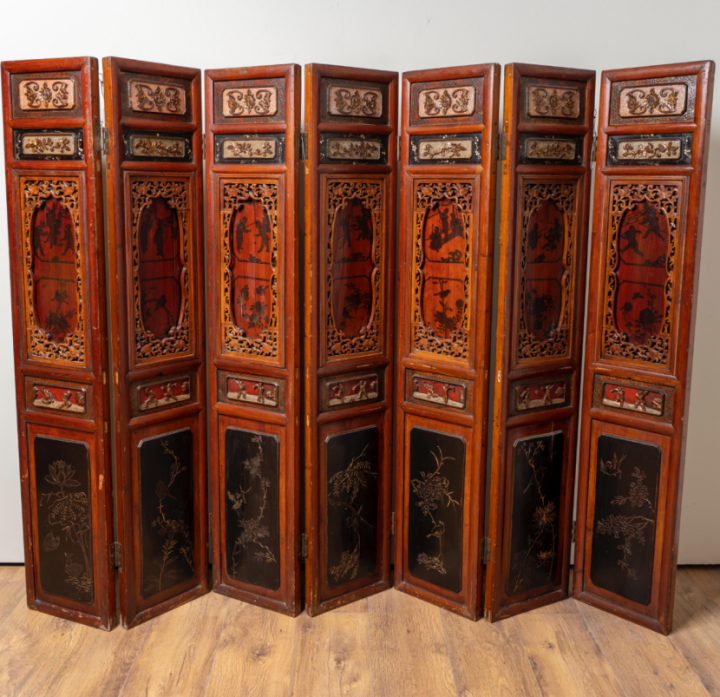 晚清民国回流朱漆木雕屏风,糅合多重工艺的传统中式屏风,以朱漆为底,运用描金工艺,底部黑光阴刻菊、梅、竹、菊等花鸟图案,中部为手绘婴戏图,上部分为朱金漆雕花卉和蝠纹。细细观赏,大气精巧,你会被老祖宗的审美折服。
