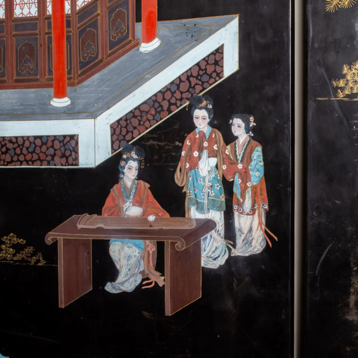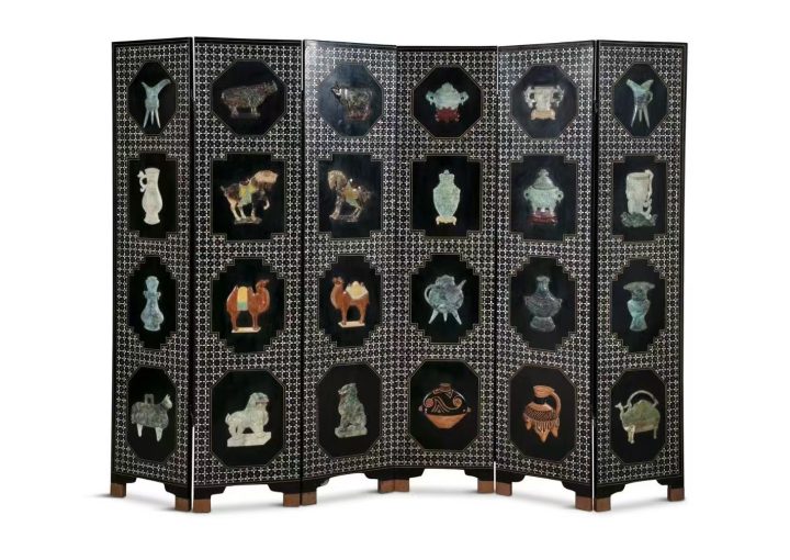 另外两面屏风分别为汉宫春晓主题的彩绘漆艺屏风和礼器瑞兽纹中式回流玉石镶嵌屏风,广受欧洲藏家追捧,在绘画和主题上都延续了清代和民国时期的工艺匠心。