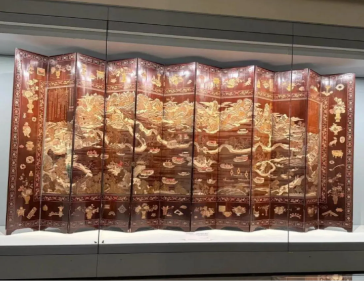 “屏风之上——一带一路会客厅”的核心展品,是被誉为“古代一带一路明星商品”的科罗曼多屏风,又叫款彩屏风,产自中国,以“多层大漆深刻、填彩漆金箔”的款彩工艺描绘山水人物,通过海上丝绸之路远销欧洲,成为欧洲贵族庄园里的“东方幻梦”。