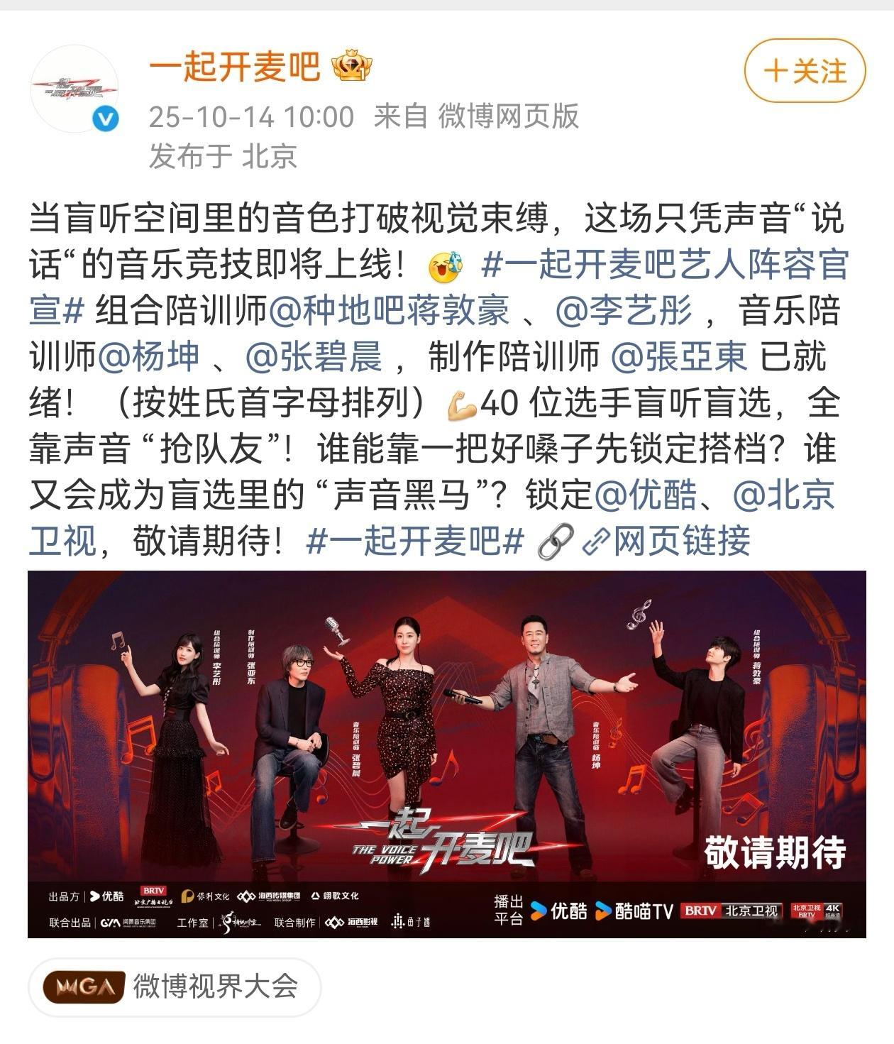 《一起开麦吧》主演阵容: 蒋敦豪、李艺彤、杨坤、张碧晨、张亚东等
