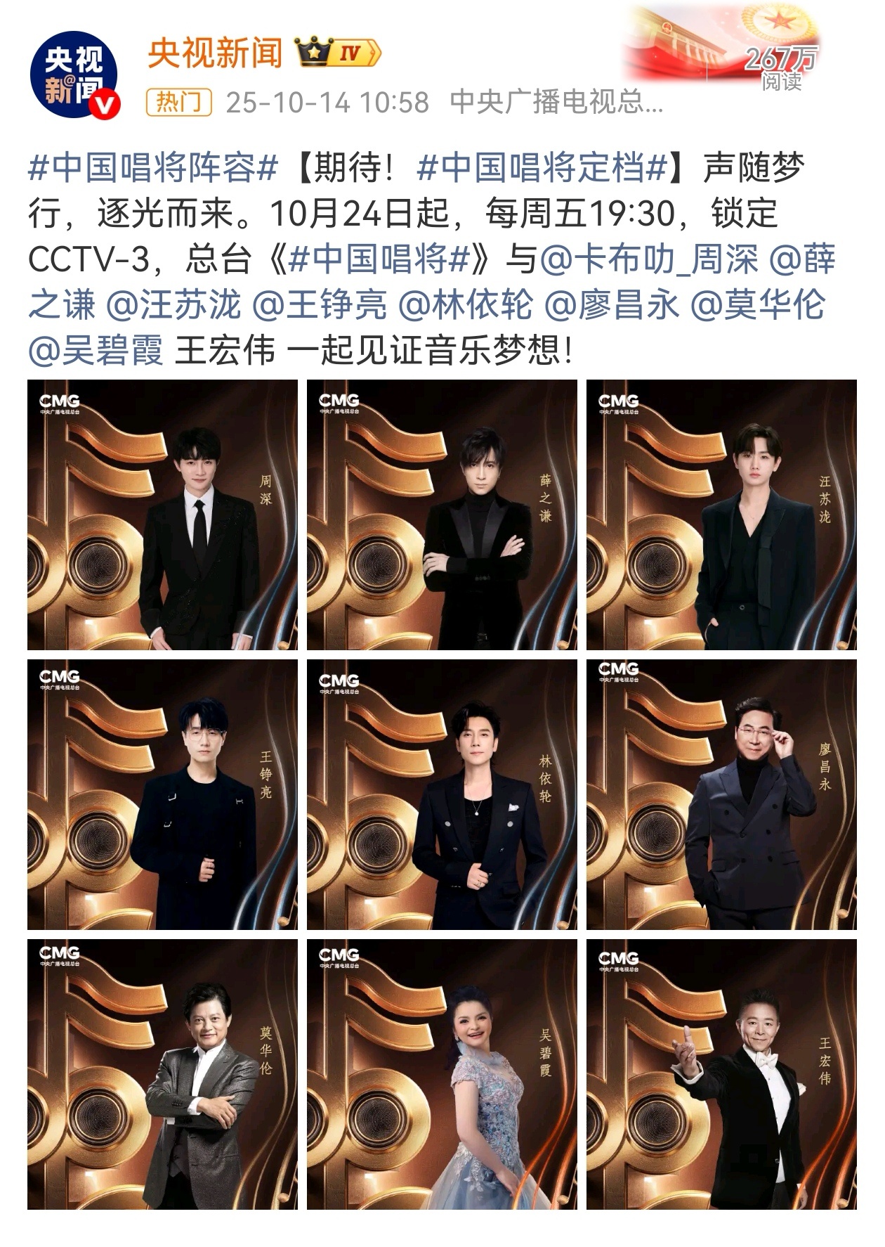 《中国唱将》主演阵容: 周深、薛之谦、谭维维、阿云嘎、汪苏泷、王铮亮、林依轮、廖昌永等