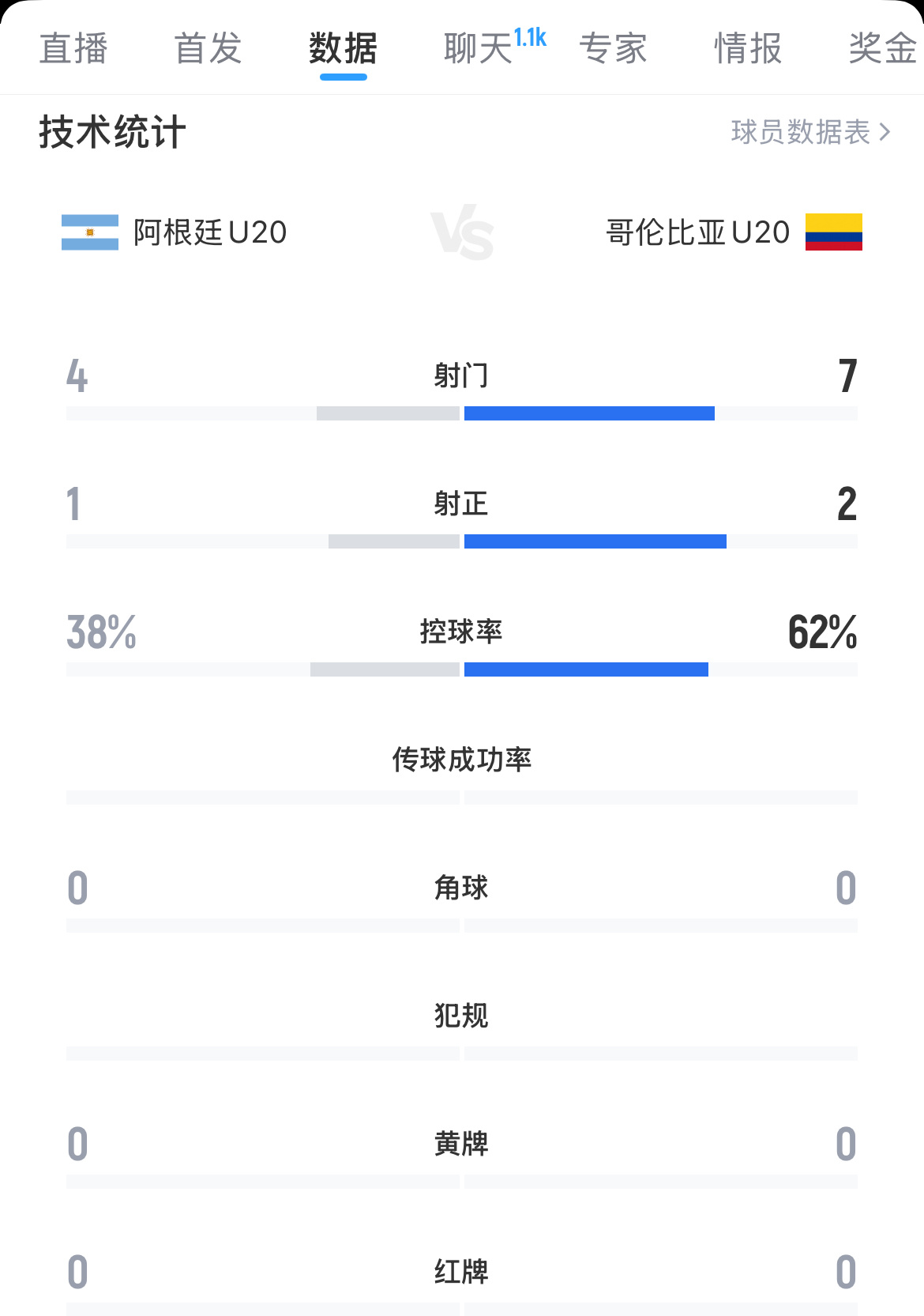 阿根廷u20vs哥伦比亚u20 半场0比0