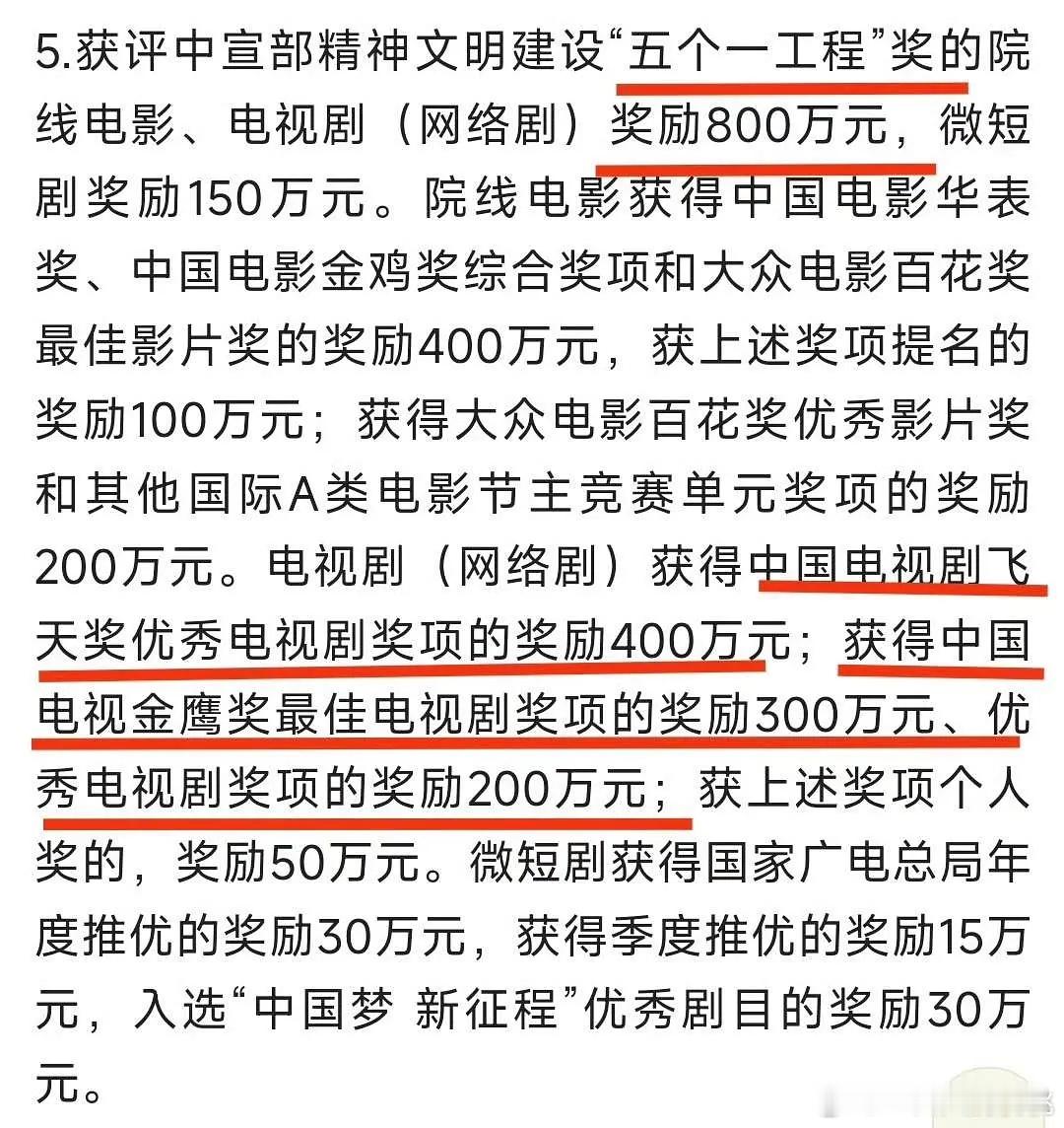 广东影视的奖励zc“五个一工程奖”:800w“华表奖”“金鸡奖”:获奖400w,