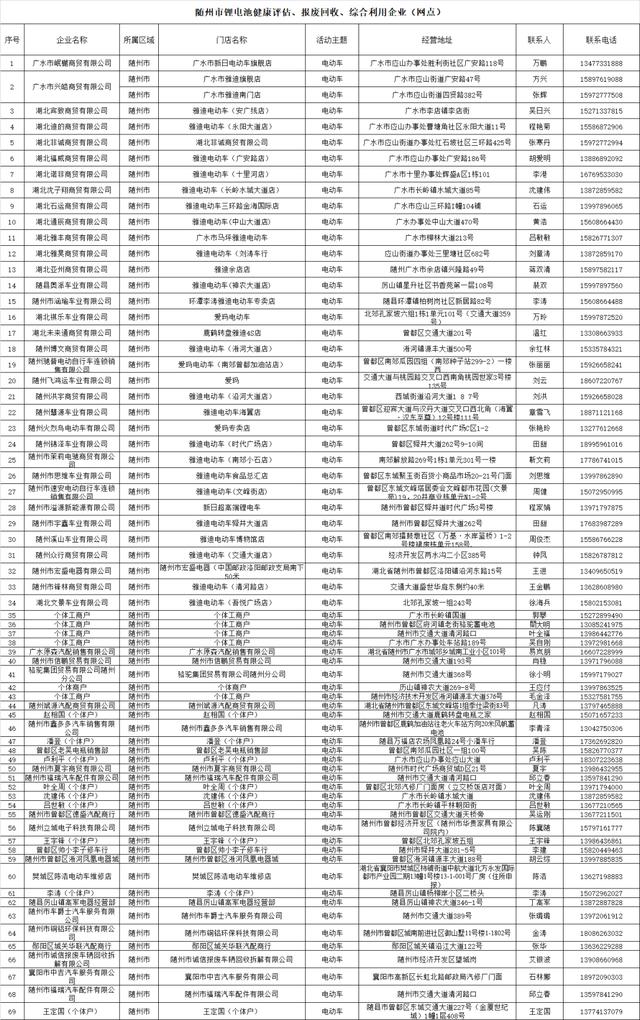 随州市锂电池健康评估、报废回收、综合利用企业(网点)