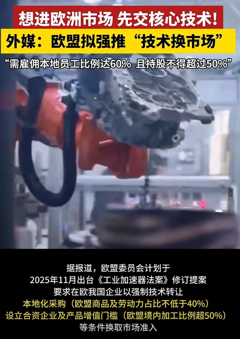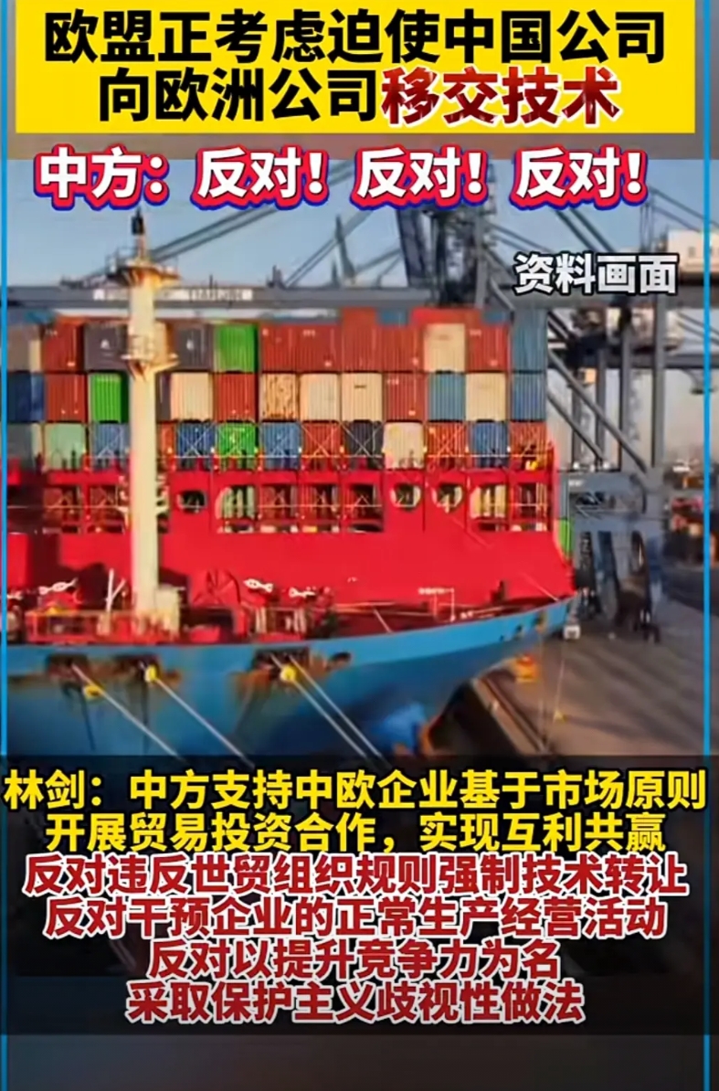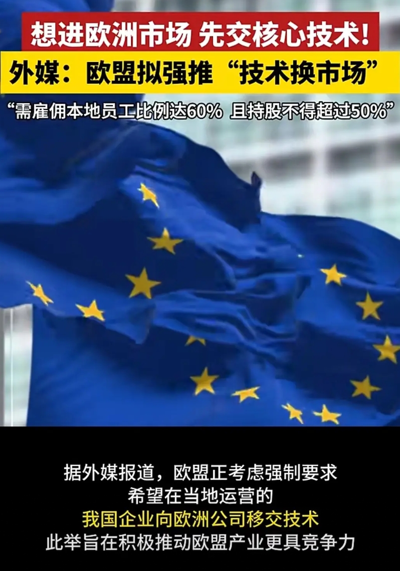 欧盟逼迫中国的企业以技术换市场!中国企业要想进欧盟,必须交出自己的核心技术。我们长期以来以市场换技术,终于等到别人要求我们以技术换市场的这一天了!这充分证明我们自己的核心技术发展起来了。相信中国企业的看法一致,宁可丢掉欧盟这个市场,也不交出自己的核心技术!
