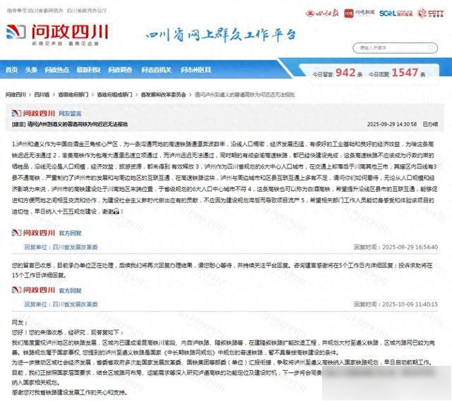 近日,有网友在“问政四川”网络问政平台留言咨询,为何泸州到遵义的高铁迟迟无法报批,表示期待该项目纳入“十五五”规划建设。对此,四川省发展改革委进行了回复。