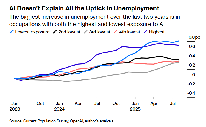 这表明,即便AI确实是近期劳动力市场放缓的原因之一,也并非唯一因素。新员工可能会受到更大影响,仅仅是因为在就业市场出现裂缝时,他们往往最先受到波及。