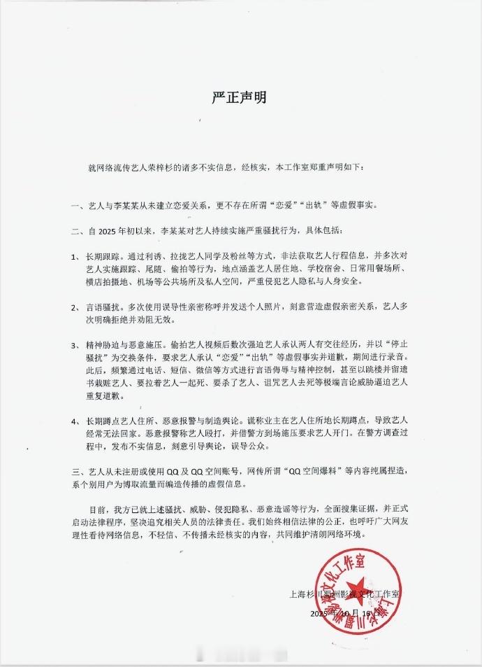 荣梓杉方否认恋爱出轨荣梓杉方称被骚扰 15日,演员发文曝荣梓杉恋爱期间出