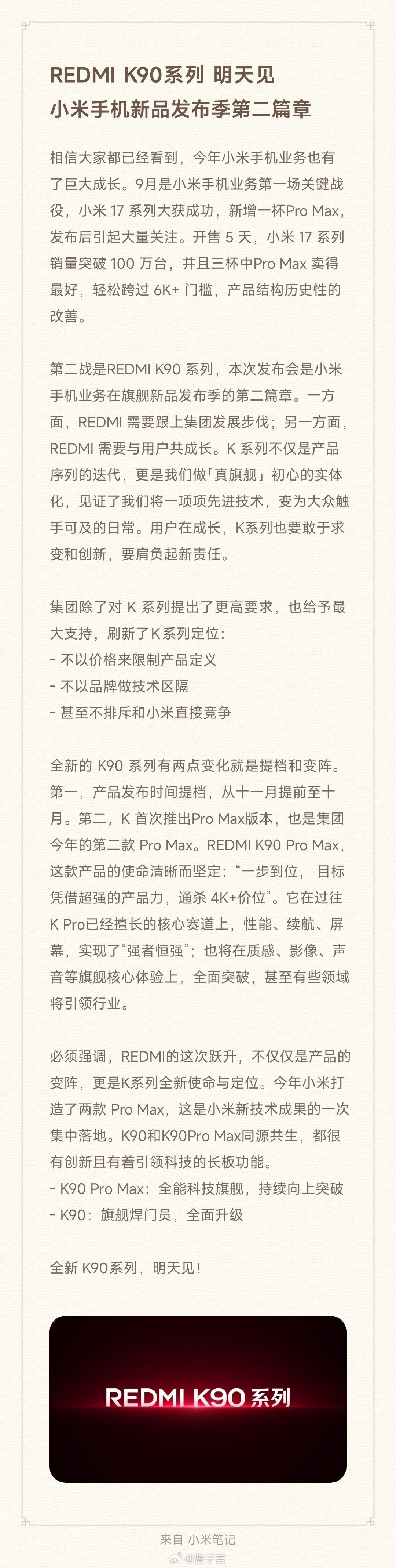 红米 K 系列这次也刷新定位了:发布时间提档至 10 月,推出 Pro Max 机型,不排斥和小米直接竞争。