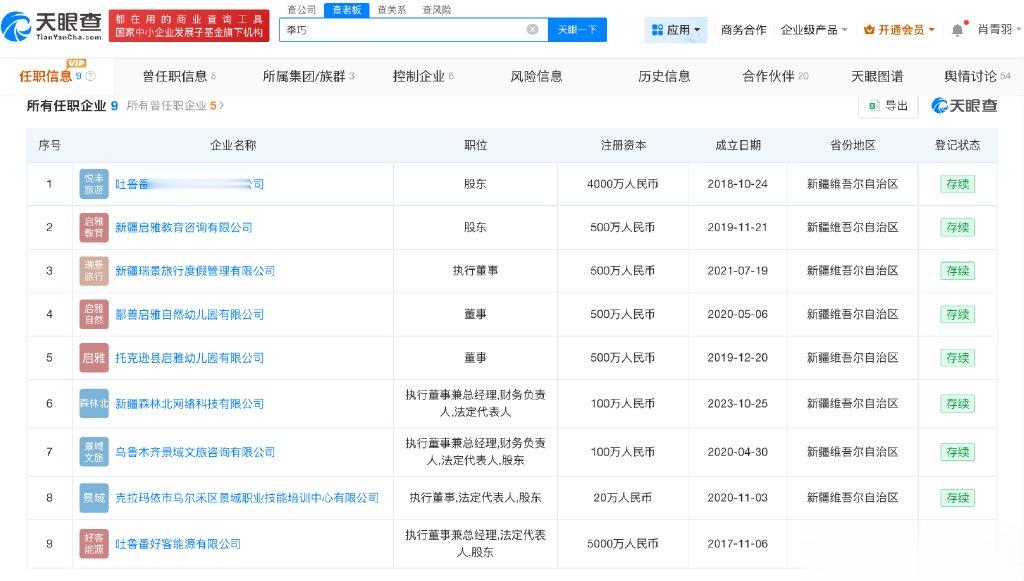 天眼查App显示,森林北(本名李巧)名下共关联9家企业,其中8家为存续状态,包括吐鲁番悦丰旅游投资有限公司、新疆启雅教育咨询有限公司、新疆瑞景旅行度假管理有限公司、新疆森林北网络科技有限公司等,涉及旅游投资、教育咨询、网络科技等领域,森林北在上述公司担任执行董事、总经理、财务负责人等职务。