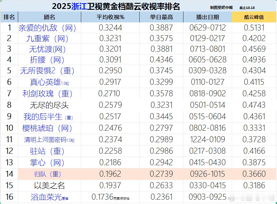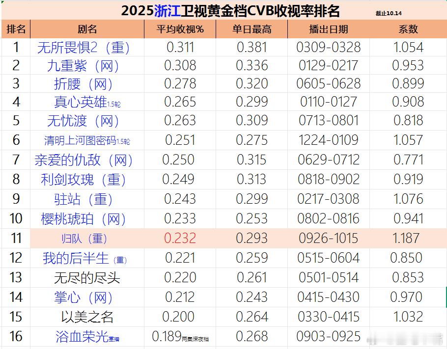 浙江卫视《归队》收官战报!还有一天没出来但是不影响排名。归队最后三天酷云好奇怪,突然低那么多,都是0.14几。如果说周间比周末低,那么上周周间也没那么低啊至少也有0.20,有点看不懂。
