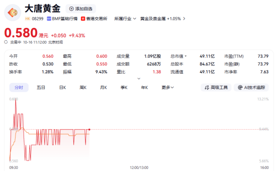 上证报中国证券网讯(李子健记者周亮)10月16日,港股黄金及贵金属板块延续昨日涨势,大唐黄金涨幅居前。截至11时12分,大唐黄金股价涨超9%。消息面上,澳新银行将今年底黄金价格预测上调至每盎司4400美元,预计到2026年6月将达到近每盎司4600美元的峰值。