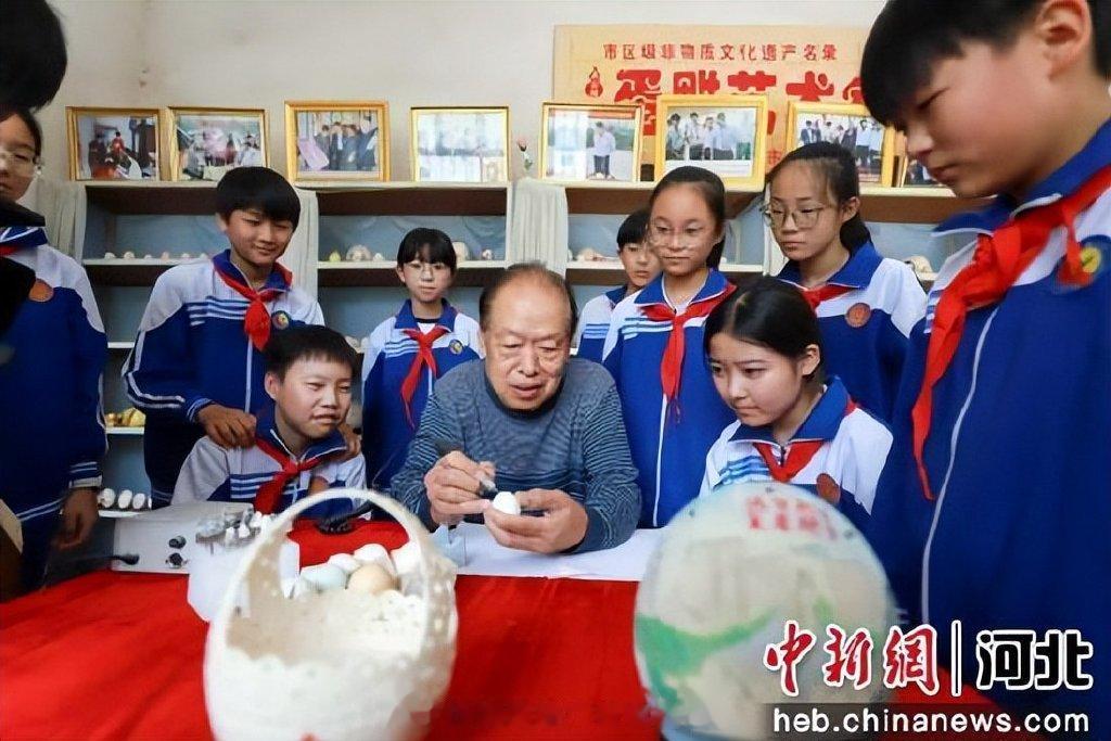 图为传承人郑青山教学生蛋雕。薛建东摄