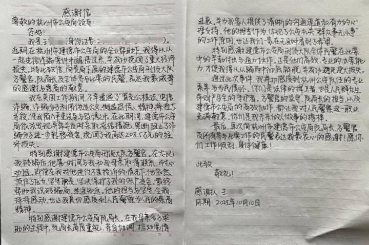 近日,杭州市公安局收到黑龙江王女士的亲笔信,建德反诈民警方建华在被误解、投诉一个月后,终于迎来了澄清和尊重。