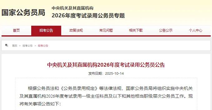 国家公务员局网站公布了中央机关及其直属机构2026年度考试录用公务员公告,本次共计划招录3.81万人。其中,竹山有5个岗位,招录9人。十堰共有54个岗位,共招录94人。