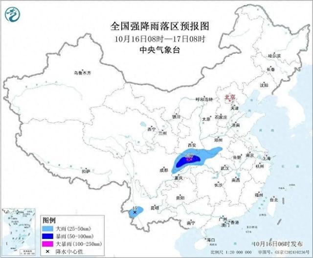 10月16日06时,中央气象台发布暴雨蓝色预警:预计,10月16日08时至17日08时,陕西南部、河南南部、湖北西部、四川盆地东北部、重庆东北部、云南西南部等地部分地区有大到暴雨,其中,陕西东南部、湖北西北部、四川盆地东北部、重庆东北部等地部分地区有大暴雨(100~120毫米)。上述部分地区伴有短时强降水(最大小时降雨量20~40毫米,局地可超过50毫米)。