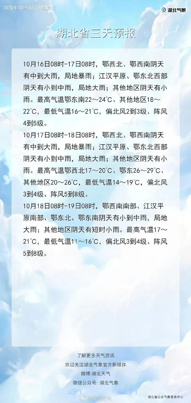 10月16日08时07分,咸宁市气象台发布暴雨黄色预警信号:过去3小时赤壁市最大降水出现在茶庵岭镇(白石)为39.9毫米。预计今天白天赤壁南部将出现大雨到暴雨,累计雨量40-60毫米,并伴有雷暴大风,山区山洪、地质灾害、城乡积涝、中小河流洪水风险较高,请注意防范。