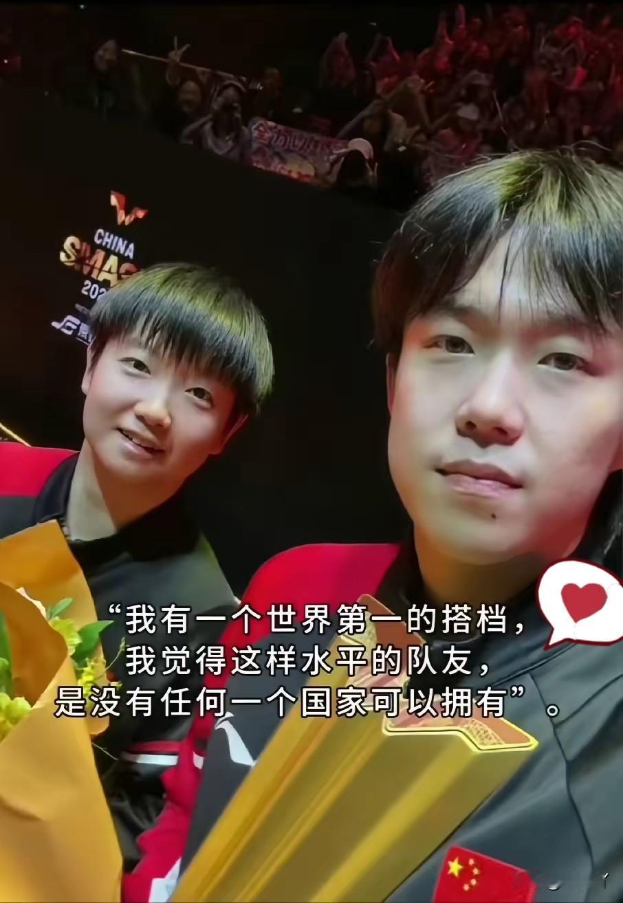 大头这段骄傲、自豪的话, 深深戳中了人们的心! 他说:“我有一个世界第一的搭档,我觉得这样水平的队友,是没有任何一个国家能拥有的”! 王楚钦在混双赛后采访中,望着身旁的孙颖莎说道。 “大头今天做得很好,他今天三场比赛,自己今天辅助他得分。”孙颖莎在WTT中国大满贯混双赛后这样评价王楚钦。这对组合的默契不仅体现在技术上,更展现在那些无需言语的配合中,一个眼神、一个动作,彼此心领神会。 当王楚钦一日三赛疲惫不堪时,是孙颖莎在混双比赛中主动承担更多责任,辅助他稳住局势。这种相互理解与支持,让他们在赛场上如同一人,跑动丝滑,攻守合一。 王楚钦那句“世界第一的搭档”不是空洞的夸奖,而是基于实实在在的成绩和实力 看看孙颖莎的成绩单吧,那是一条闪耀着金光的职业道路。 作为女单世界排名第一的选手,她在国乒的地位有目共睹。 在男女团大合影时,王皓、邱贻可、王楚钦、孙颖莎四人占据着明显的C位,这张图片无声地宣告了两位世界第一在国乒的核心地位。 孙颖莎的实力不仅体现在排名上,更体现在关键时刻的稳定发挥。 她与王楚钦的混双组合,被球迷亲切地称为“莎头组合”,在国际赛场上几乎是所向披靡。 国乒的混双组合之所以难以被击败,不仅仅是因为个人能力出众 在WTT中国大满贯的混双1/4决赛中,“莎头”组合展现了惊人的默契,全场跑动丝滑,被网友感叹“如同一个人”。 这种默契不是一蹴而就的,是经过长期训练和比赛磨合而成的。 相比之下,国外组合往往因为各种原因难以保持长期稳定的配对,而中国乒乓球队却能够为优秀运动员提供持续合作的机会。 王楚钦和孙颖莎从青少年时期就开始搭档,彼此熟悉对方的球路和习惯,这种默契是任何临时配对的组合无法比拟的 王楚钦本人作为男单世界第一,在赞美搭档时表现出来的谦逊和大度同样令人钦佩 在印度亚锦赛男团1/4决赛中,王楚钦以3:0横扫伊朗选手侯赛因,印度解说员忍不住夸赞:“这就是为什么他是世界第一。” 世界第一的认可不仅仅来自解说员,甚至对手也心服口服 比赛结束后,伊朗球员们跑来索要签名,第一个就找到了王楚钦。大头尽可能满足每个人的要求,在球拍和衣服的多个地方签名。 王楚钦的谦逊低调没有架子,赢得了对手的尊重和认可。 王楚钦和孙颖莎的搭档关系之所以如此牢固,是因为他们共同经历了从青涩到成熟的成长过程 从初出茅庐的小将到世界第一,他们一起走过了无数场比赛,一起面对过胜利的喜悦和失败的挫折。 在WTT横滨冠军赛上,莎莎和大头竟然双双摘银,遭遇了“同病相怜”的时刻。 赛后,一张两人手持紫色小奖杯的合照在网上疯传。两人脸上虽然带着一丝遗憾,但更多的是一种惺惺相惜的释然。 有粉丝调侃说:“不能顶峰相见,就在半山腰见吧!” 事实上,这次的失利反而让他们更加清楚地认识到自己的不足,为未来的进步指明了方向。 回到王楚钦那句发自内心的话,他所表达的不仅是对搭档的认可,更是对中国乒乓球队整体实力的自信 “没有任何一个国家能拥有的”不只是孙颖莎这样的选手,更是中国乒乓球队完善的培养体系和雄厚的人才储备。 当王楚钦在亚锦赛男团颁奖典礼上开怀大笑,与队友们共享胜利的喜悦时,我们看到的不仅是一个世界第一的笑容,更是一个团队核心人物的满足和自豪。 王楚钦甚至主动让出C位给了梁靖崑、向鹏、周启豪等人,自己站到了男团的最边上。 这种团队精神和谦逊态度,正是中国乒乓球队长盛不衰的秘诀。 在印度亚锦赛上,王楚钦击败伊朗选手后,伊朗球员们纷纷跑来索要签名,第一个找的就是他。那一刻,世界第一的意义不再只是排名,而是赢得对手尊重的实力与风度。 而当他与孙颖莎一同举起混双冠军奖杯,那种无需言语的默契,印证了他所说的“没有任何一个国家能拥有的”搭档。国乒的强大,不只在于个别运动员的卓越,更在于那种传承不息、携手共进的团队灵魂。 各位读者你们怎么看?欢迎在评论区讨论。