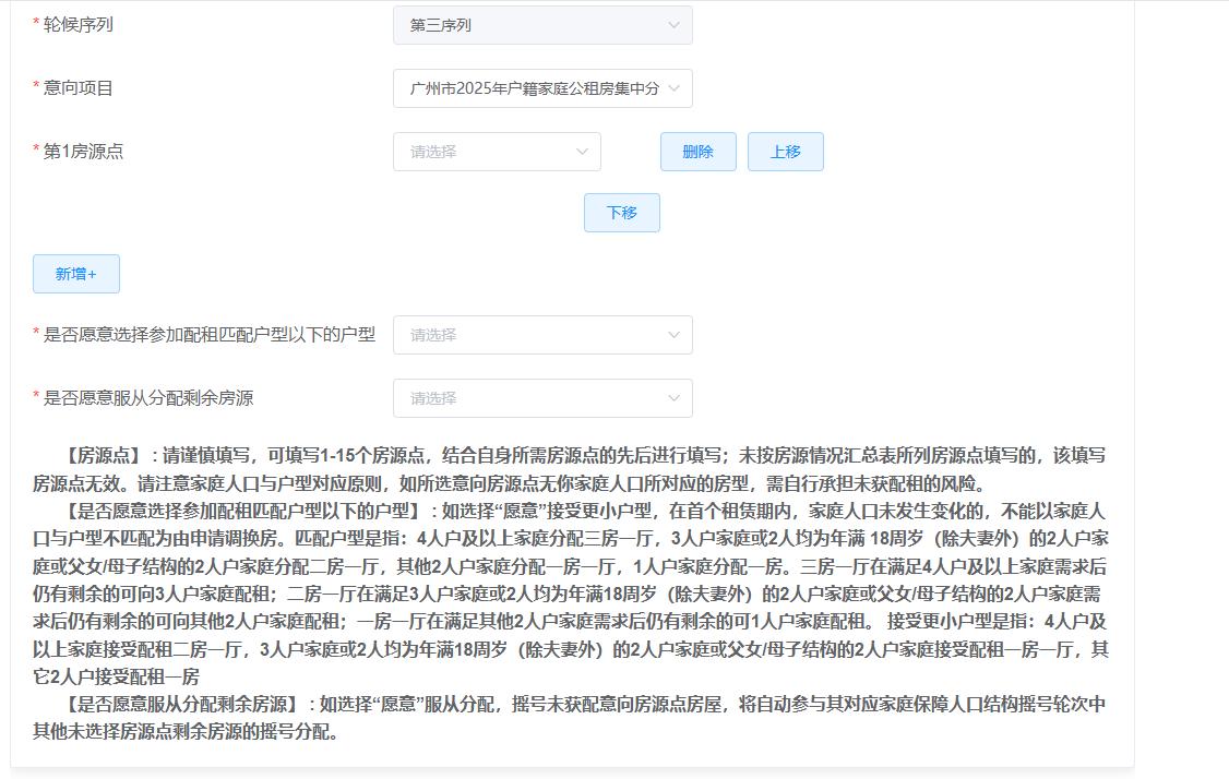 今天,广州市户籍公租房开始意向登记了,有些朋友昨晚一过12点就上网填意向了,我说不用这么早啊,你只要在规定的时间内提交就可以了,她说排名太后了,反正今年都是陪跑,填完就完成任务了,这心态是真的好。 今年除了可以在线下填意向之外,也可以在线上填了,节省很多时间,但线上意向提交以后是不能修改的,所以要非常仔细,首先你要明确知道自己的家庭分配什么户型(图二所示),第二在填房源的时候,你要很清晰的知道这个房源点有没有和你家庭对标的户型,比如你是个人申请,标配是单间,但在两人家庭分剩下的情况下也是有机会获得一房一厅的,可是你填的这个房源点只有两房一厅和三房一厅,那么你所填的意向就变成无效意向了。 有朋友流程看得很仔细,问我,既然提交了不能修改,那为什么在12月2日到8日会有公示意向登记情况并受理异议申诉?这是因为还有线下填意向,线下填意向是由街道的工作人员帮你把房源意向录入电脑,如果出现误录在这期间可以去申诉。 无论线上或是线下,轮候号的先后对能不能分到房子起着最关键的作用,但如何让自己更大机会入住喜欢的小区,填好意向则是很重要的一步,划重点:在没有填满15个房源的情况下,不要选择服从分配,因为服从分配是所有人都分完还有剩下的房子中按轮候号先后再重新分配,绝对是你意向之外的房子,主动选择比被动接受好,如想了解更多,请看我置顶帖文《在广州申请公租房如何填好意向?》,这里就不多写了,祝大家如愿以偿,早日入住!