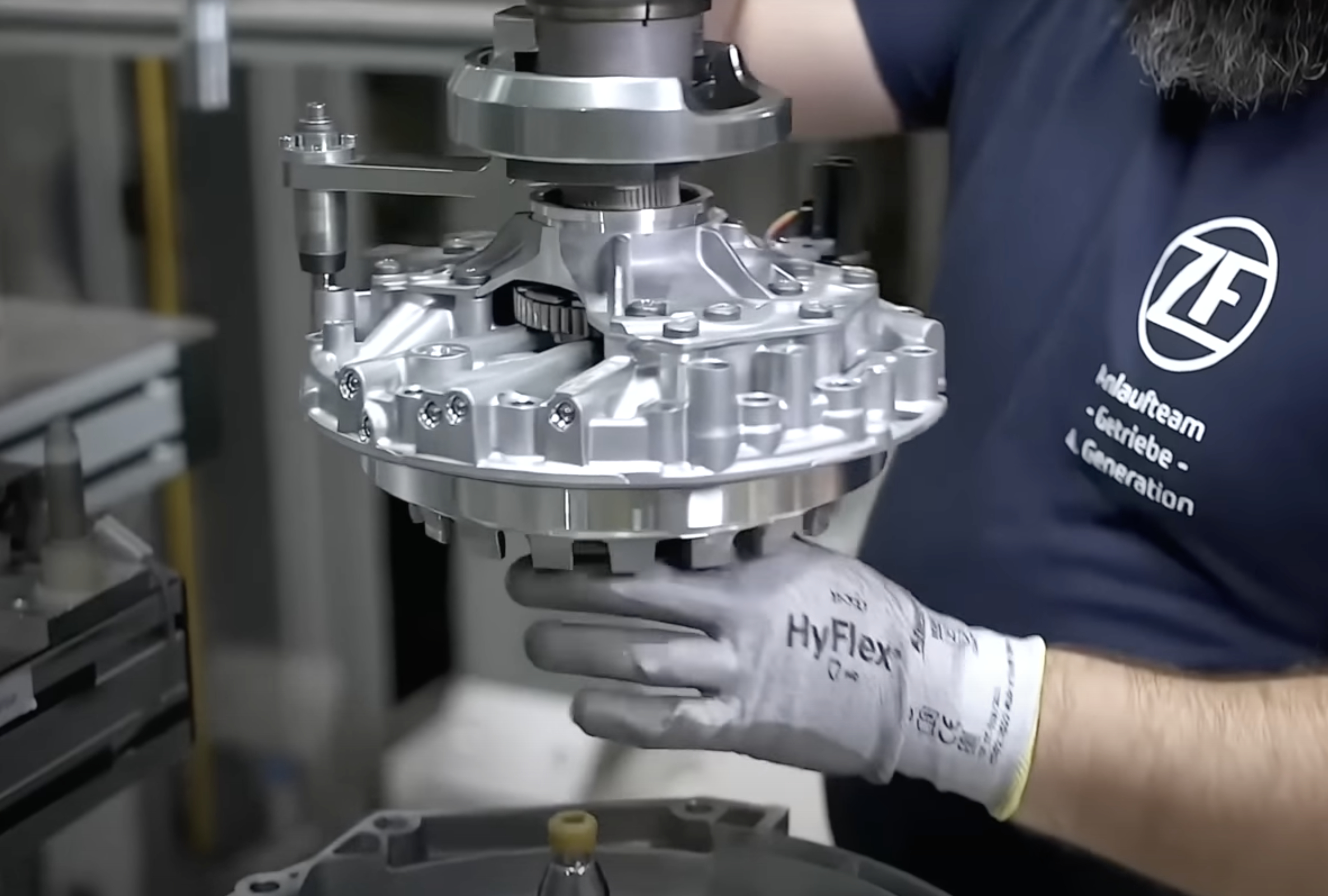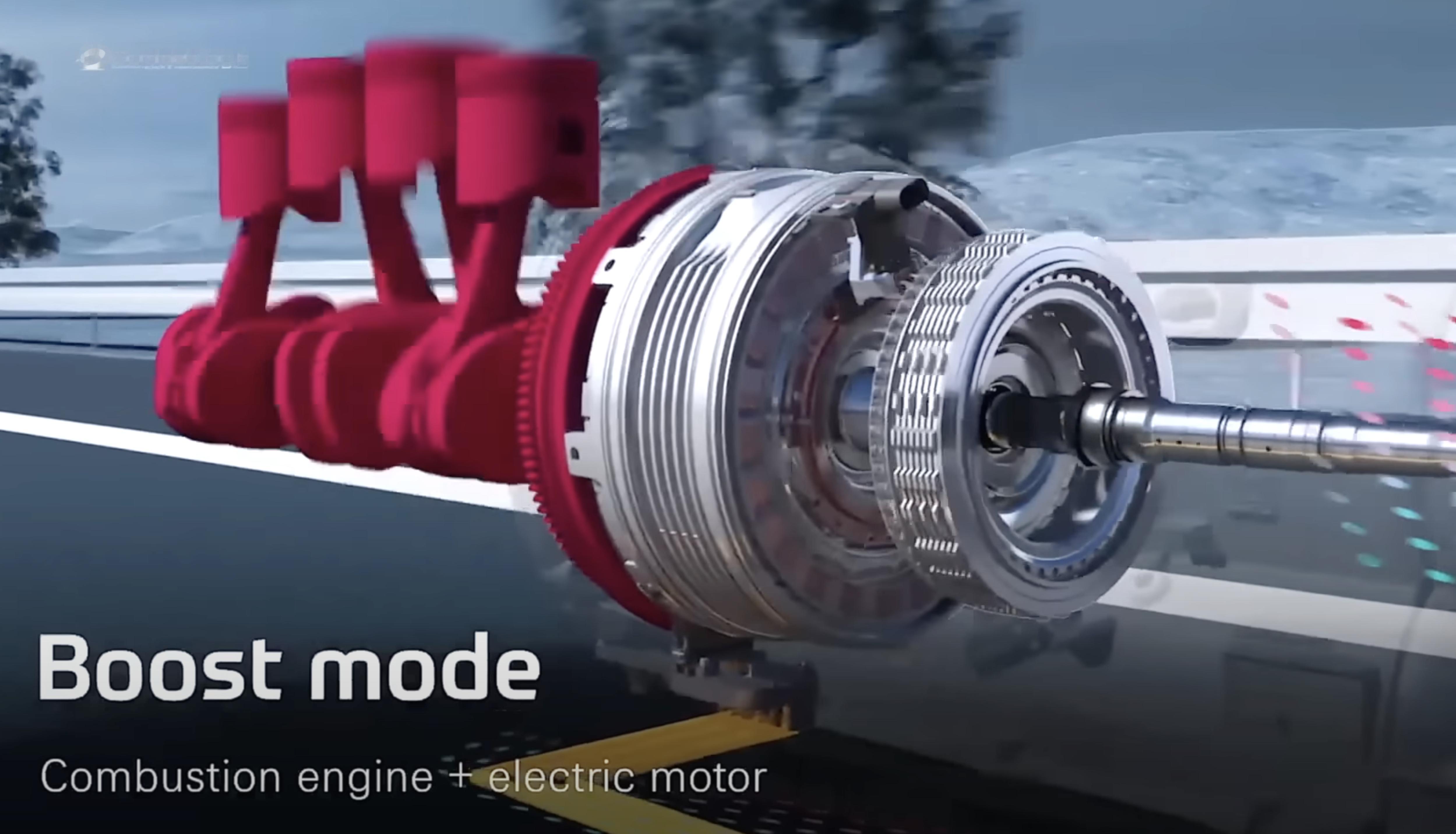 M5 使用了新一代专为插电混动系统设计的 ZF 8 速自动变速箱。在发动机与变速箱输入轴之间,加入了 K0 离合器与电动机。不再使用传统液力变矩器,而是使用 ILE 多片离合器。这样,可以提高传动效率,让变速箱体积在加了电机的情况下与前一代基本保持一致。没有液力变矩器,无法获得传统 AT 的增扭效果。但是这部分起步时缺失的扭矩,可以通过电动机轻易的补回来。