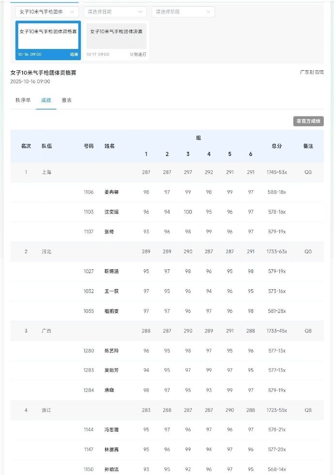 直播吧10月16日讯全运会女子10米气手枪团体资格赛,上海队追平全国纪录,超世界纪录,晋级金牌赛。