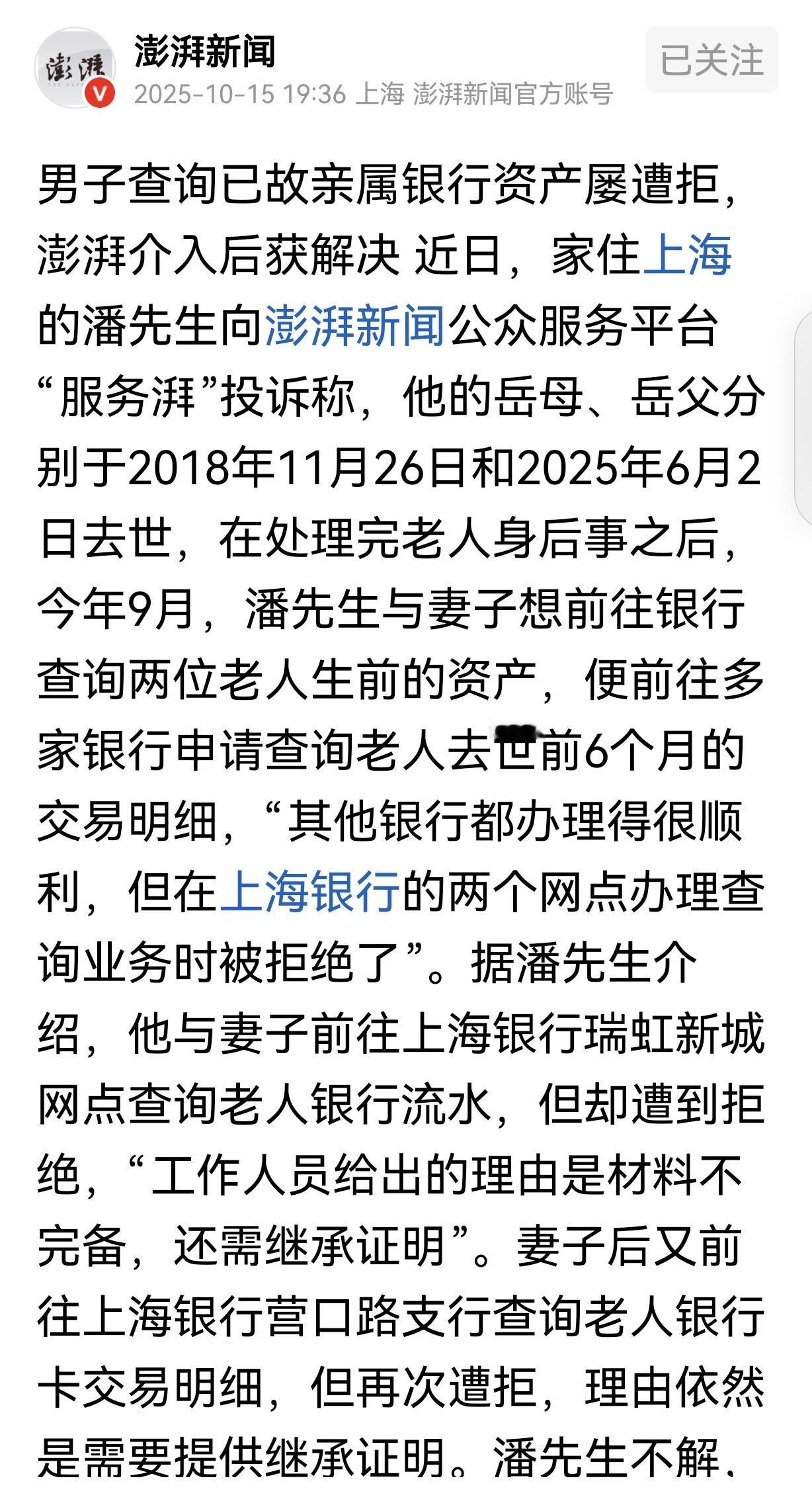 上海,一男子的岳父母先后去世,去世,他处理完后事,去多家银行查2位老人生前资产,其他银行都办的很顺利,但有家银行却直接把他拒绝了,必须让他出示继承证明,否则不给他查。男子气坏了:我老婆是第一顺序继承人,材料齐全、符合规定,在其他银行都让查,为啥你们不给办?银行:你可以去仲裁、也可以去告。 2018年11月26日,潘先生的岳母撒手人寰,都说一个女婿半个儿,岳母生前把潘先生当亲生儿子疼,他也把岳母当亲妈看,所以,潘先生强忍悲痛,和妻子给岳母操办后事。 送走岳母后的第7年,也就是2025年6月2日,岳父也病逝了。 连着几年,双亲一前一后走了,对潘先生夫妻打击很大,可生老病死谁也阻挡不了,还好,在老人活着时,他们膝前尽孝,二老走了,作为女儿女婿,也问心无愧。 潘先生夫妻处理完岳父后事,决定去银行查一下二老的资产,开启继承程序。 因为他们不知道老人都在哪家银行有存款,存了多少,但他们估计应该不少,毕竟二老在世时,都生活节俭,省吃俭用。 潘先生决定挨个银行去查,查一下岳父生前6个月的银行流水。 还好,前面几家银行都很配合,事情进展的很顺利,可万万没想到,到了上海某家银行查询时,潘先生却吃了闭门羹。 工作人员给出的理由是,潘先生出具的材料不完备,还查继承证明。 潘先生不死心,在他看来,为啥其他银行都不要求他出示继承证明,而这家银行却如此刁难?这不是没事找事吗? 潘先生不死心,打发妻子去了这家银行的另外一个网点,不料再次被拒绝,潘先生彻底被激怒了。 潘先生认为这家银行摆明了就是故意刁难,妻子是岳父母的第一继承人,而且,他自认为自己准备的意料齐全、符合规定,否则其他银行也不可能给查询。 为啥偏偏这家银行百般阻挠?这不是司马昭之心,路人皆知吗? 可银行却说,其他银行为啥在潘先生没继承证明的情况下,让他查询,跟银行没关系。 而他们银行有规定,查询去世老人的资产,必须出具继承证明,一家银行一个令,到了他们银行,就得守银行的规矩。 潘先生据理力争,银行就一句话,让他不服可以去仲裁,也可以去法院走诉讼程序,然后就不搭理潘先生了,认为他是无理取闹。 潘先生气坏了,别以为他不懂法,法律有规定,妻子作为岳父母的女儿,属于第一顺序继承人,如果理由合法正当,她有权要求银行提供岳父母的存款金额,还有半年内的交易明细。 而查询是不需要继承证明的,而这家银行拒绝他们查询,属于违法行为。 银行不但不配合,反而设置障碍,让这么普通的小事,变得复杂化了,为了这点破事,他们疲于奔命,好说歹说都不行,耽误了工作,还花了不少交通费,真是身心俱疲。 在潘先生看来,银行的态度让他很伤心崩溃,银行不应该大事化小,方便储户吗?可银行却反过来了,处处和他作对。 潘先生要求银行赔礼道歉,赔偿他误工、交通及精神损失共计200元。 但即使记者介入,银行还是要求潘先生出具继承证明。直到10月13日,潘先生才终于办理了业务。 其实,潘先生去公证处开个存款查询函就可以查了,老人最好在清醒时,把卡与密码告知子女,方便取出治疗与继承! 不要先销户,知道密码的话直接去取,在柜台上不要多说话!拿着双方的身份证就行。 内部规定只可约束内部员工和内部事务;对外没有任何效力,说白了就是废纸一张。对于以内部规定刁难客户的行为,行业管理部门应当给予一定惩戒,对储户有一个公正的交待! 太难了,百姓办点事儿都得上新闻,都得借助媒体的力量,太难了,就不能优化一下吗?可是又有多少人能上新闻?遇到多少难办的事儿?能不能让老百姓办事儿能够简单一点呢?能不能有投诉渠道,让我们尽快能够解决这个问题呢? 《银保监会办公厅 司法部办公厅关于简化查询已故存款人存款相关事项的通知》第1条规定:已故存款人的配偶、父母、子女凭已故存款人死亡证明、可表明亲属关系的文件(如居民户口簿、结婚证、出生证明等)以及本人有效身份证件,可单独或共同向存款所在银行业金融机构提交书面申请,查询已故存款人在该机构的存款信息,无需办理公证。 《民法典》第1127条规定:(一)第一顺序:配偶、子女、父母。 案例法律分析 潘先生妻子的查询资格,基于第一顺序继承人身份,潘先生的妻子作为岳父母的女儿,属于“第一顺序继承人”,继承开始后,第一顺序继承人有权依法处理已故亲属的遗产,包括查询遗产范围。因此,潘先生妻子具备查询岳父母银行资产的主体资格。 根据银保监办发〔2019〕107号文第一条,查询已故存款人存款无需公证,仅需提供三类材料: 已故存款人死亡证明;亲属关系证明,如户口簿,可证明潘先生妻子与岳父母的父女/母女关系;查询人本人有效身份证件,潘先生妻子的身份证。 案例中,潘先生夫妻已提供上述材料,但银行以“需出具继承证明”为由拒绝查询,明显违反了2019年通知的规定。 关注@灋律盐究员 学法辩是非,用法止纷争。
