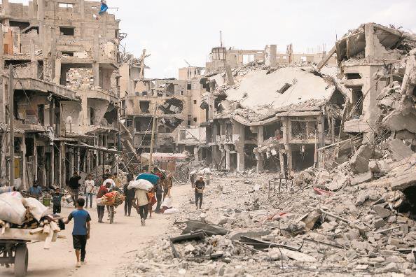 重返家园的巴勒斯坦人走过严重受损的建筑